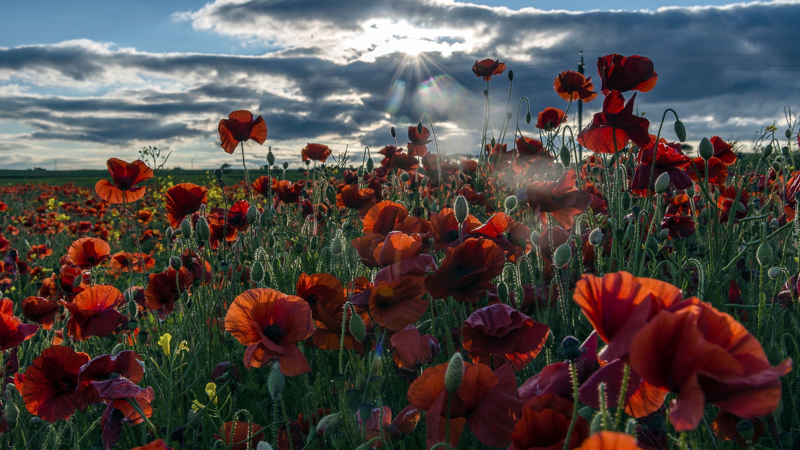 Edytor tapety: Czerwone, Maki, Promienie, Słońca, Chmury