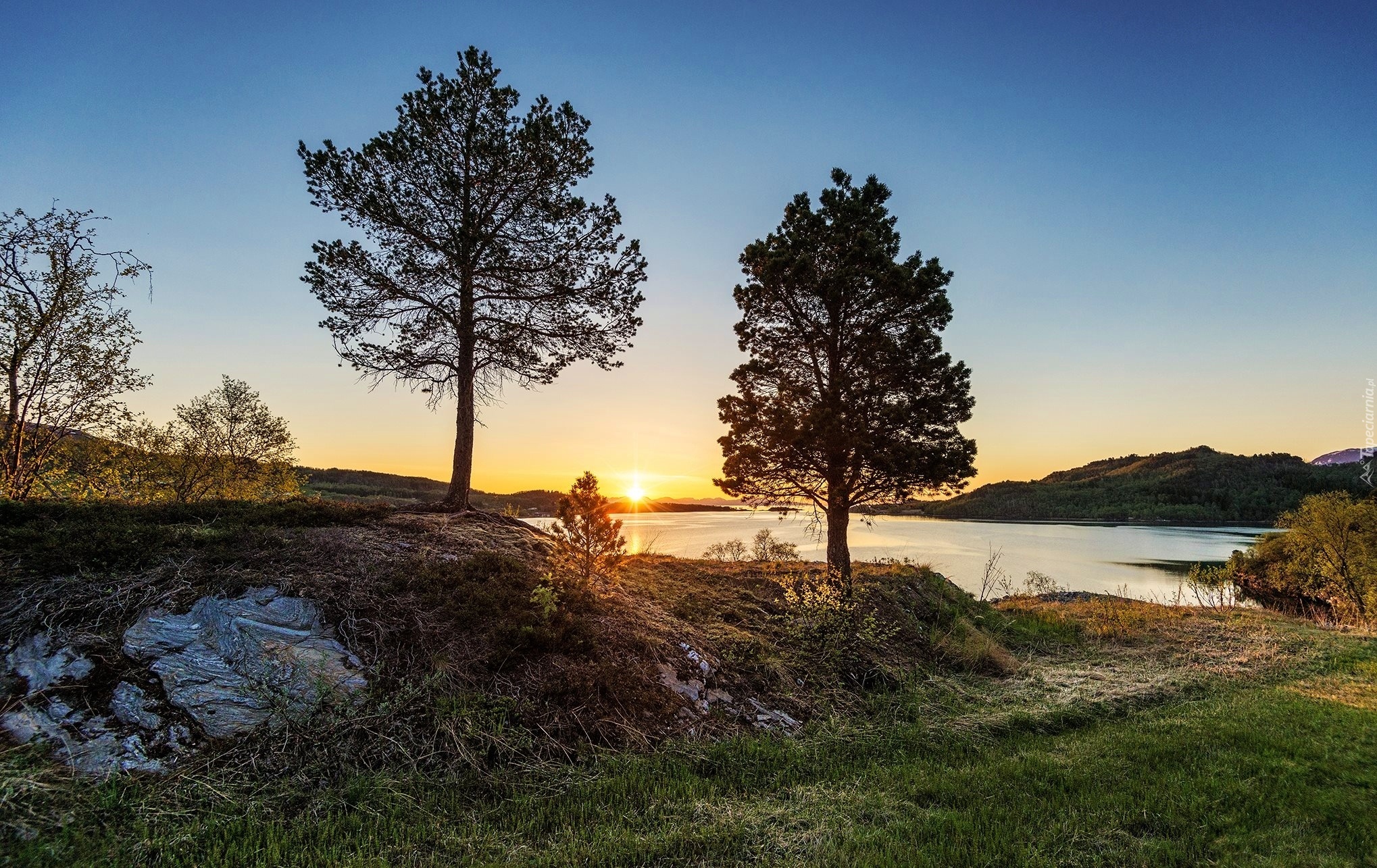 Edytor tapety: Zachód, Słońca, Dwa, Drzewa