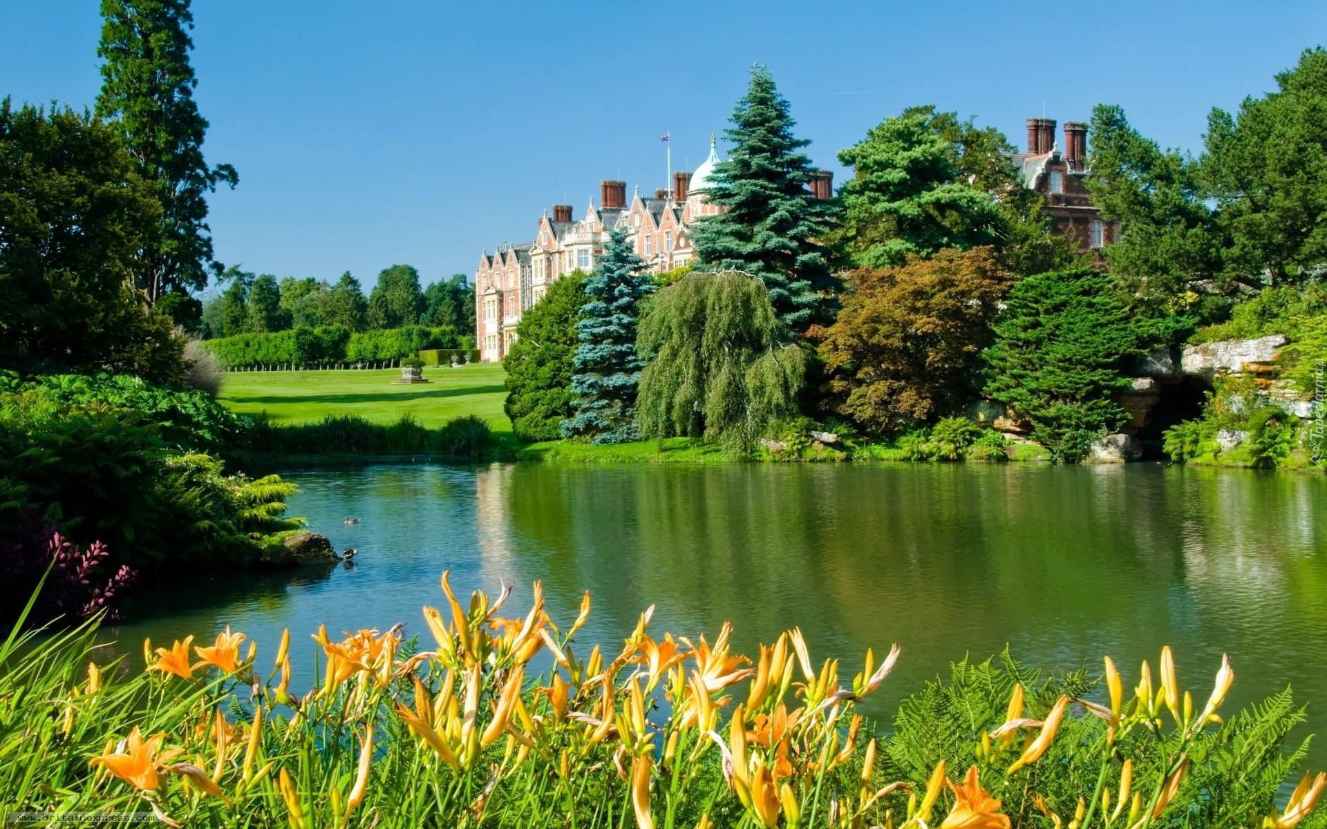 Edytor tapety: Jeziorko, Kwiatki, Drzewa, Pałac, Sandringham, Anglia
