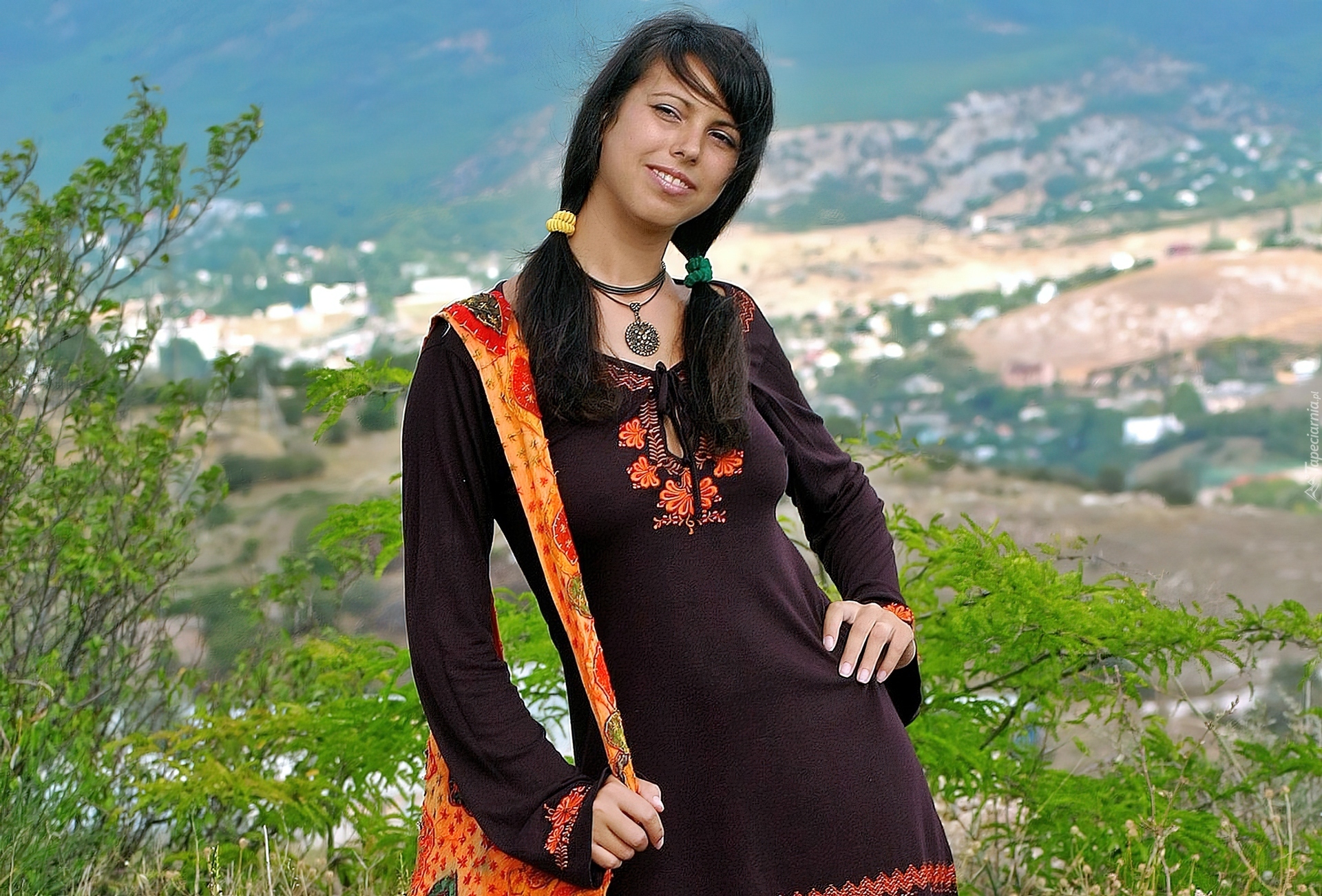 Edytor tapety: Brązowa, Sukienka, Naszyjnik, Makijaż