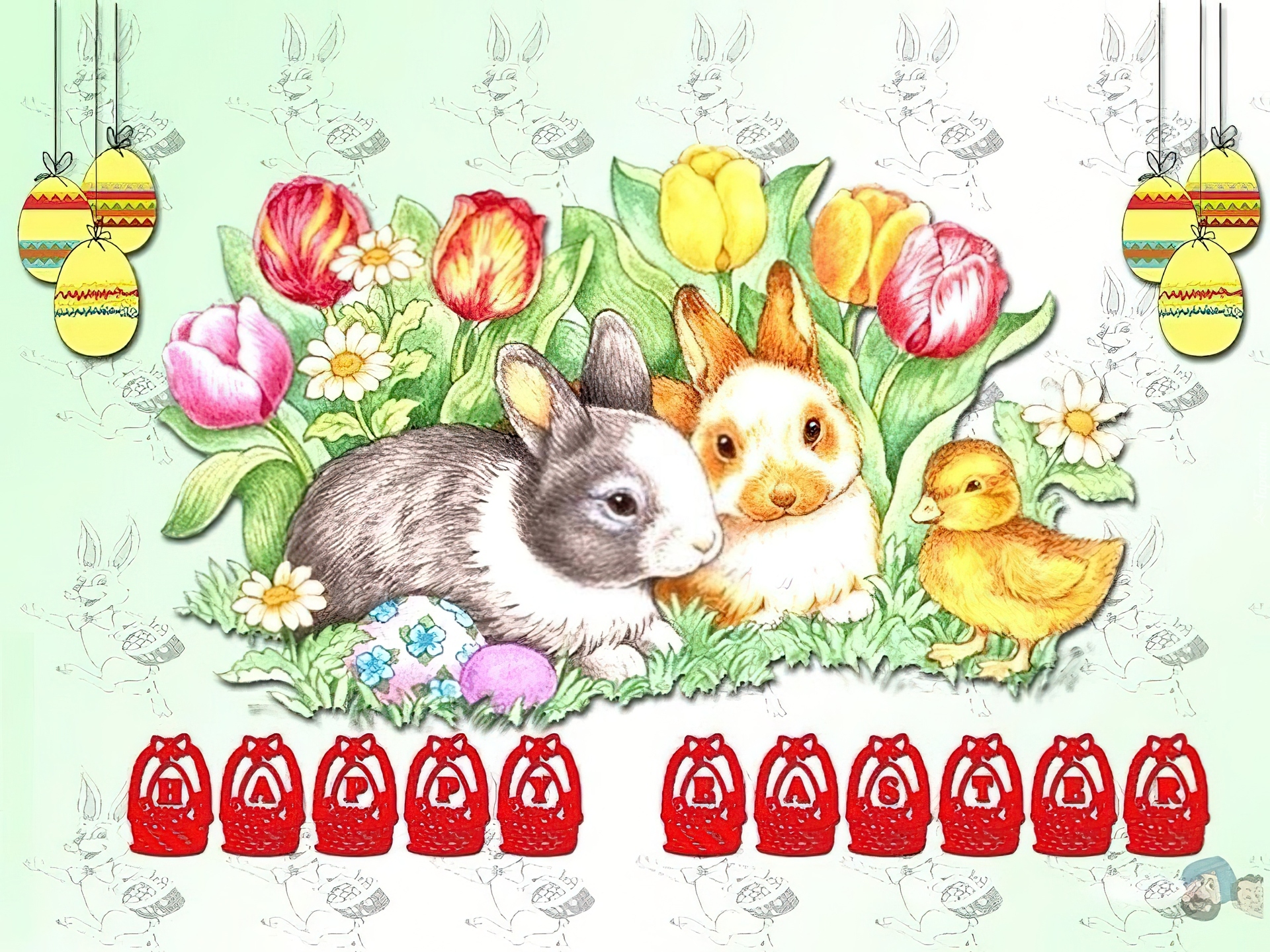 Edytor tapety: Wielkanoc,zajączki,kurczaczek,jajeczka, Tulipany