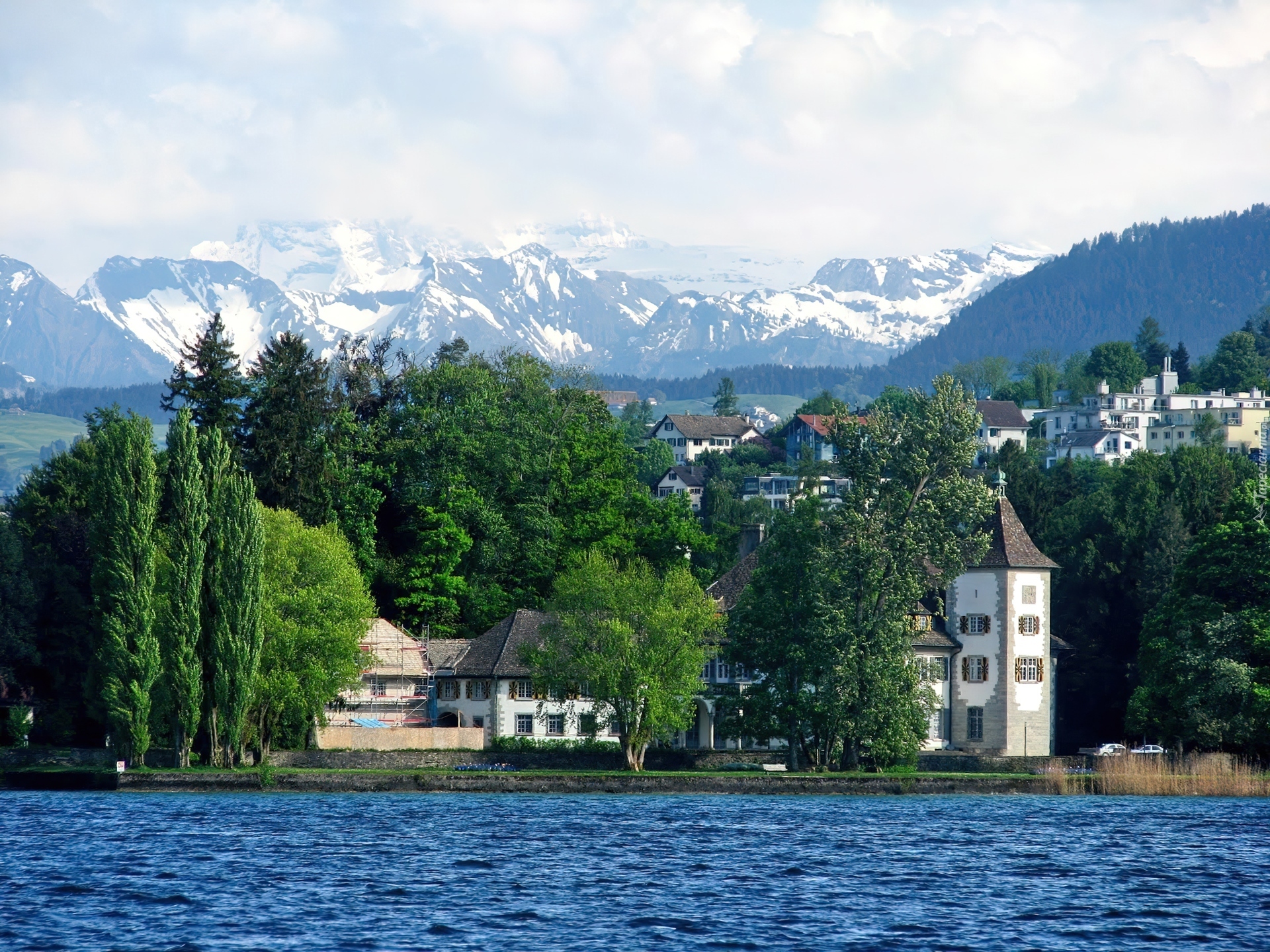 Edytor tapety: Domy, Drzewa, Rzeka, Góry, Zurych, Szwajcaria