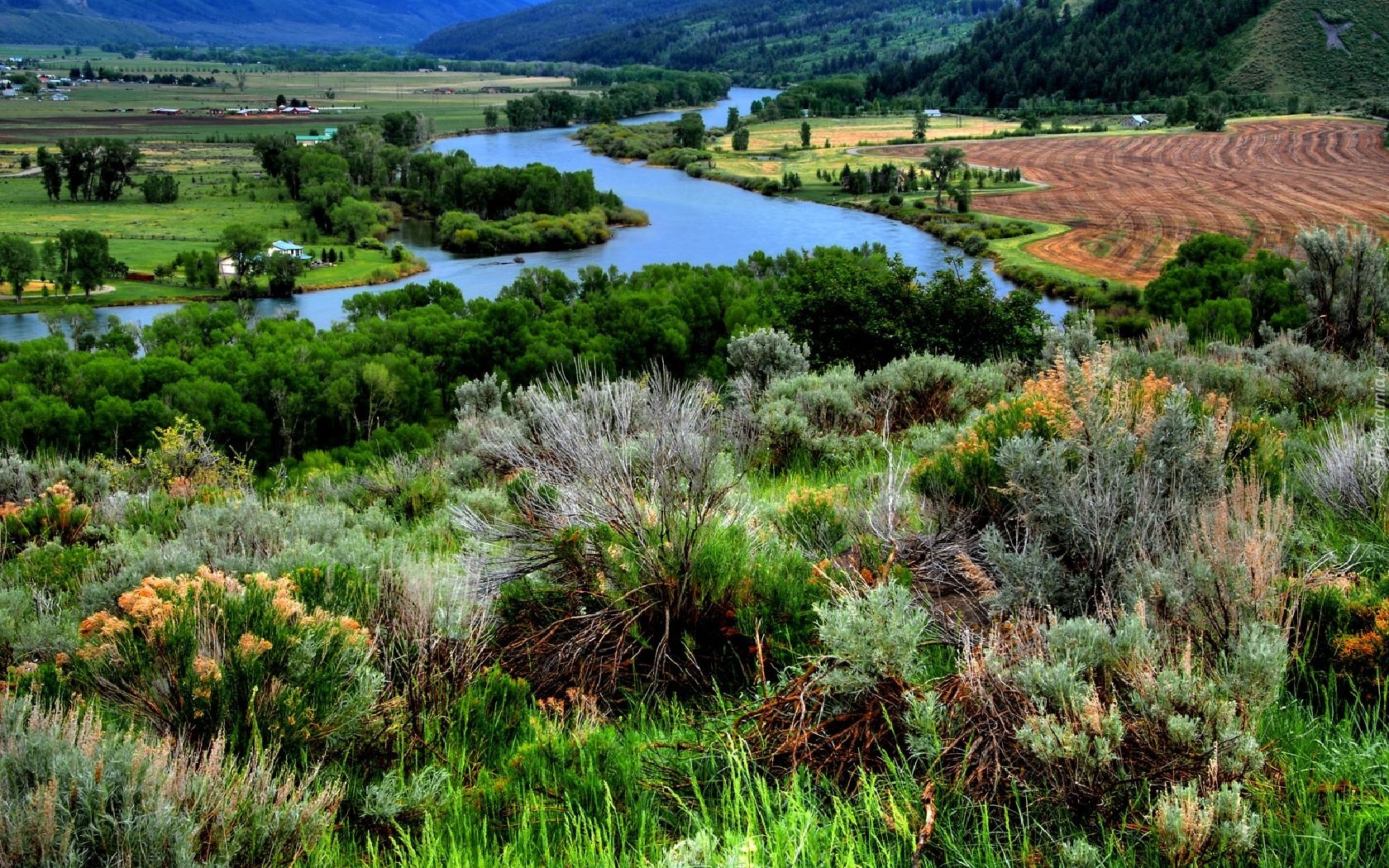 Edytor tapety: Rzeka, Pola, Drzewa, Roślinność