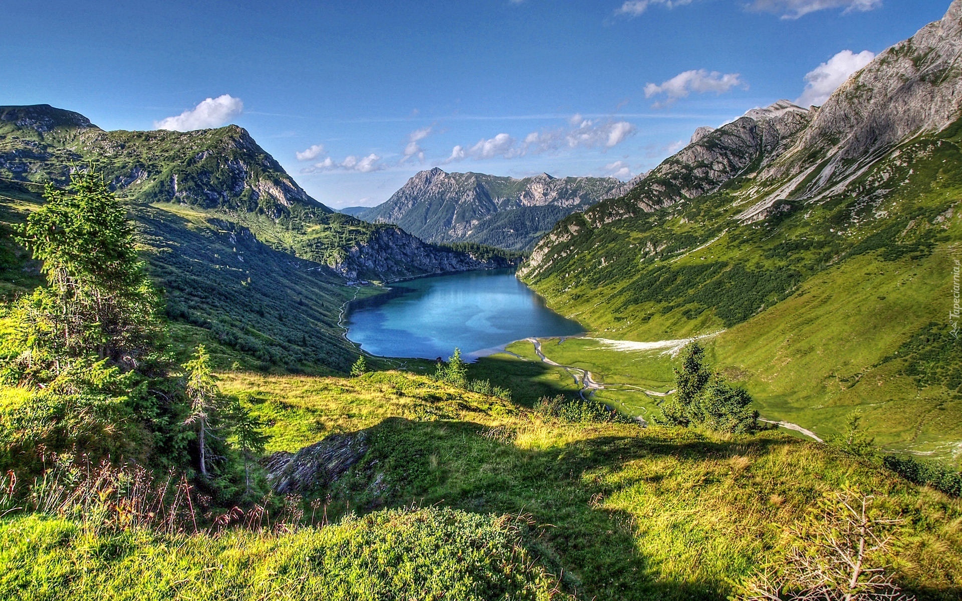 Edytor tapety: Góry, Jezioro, Polana, Ścieżka