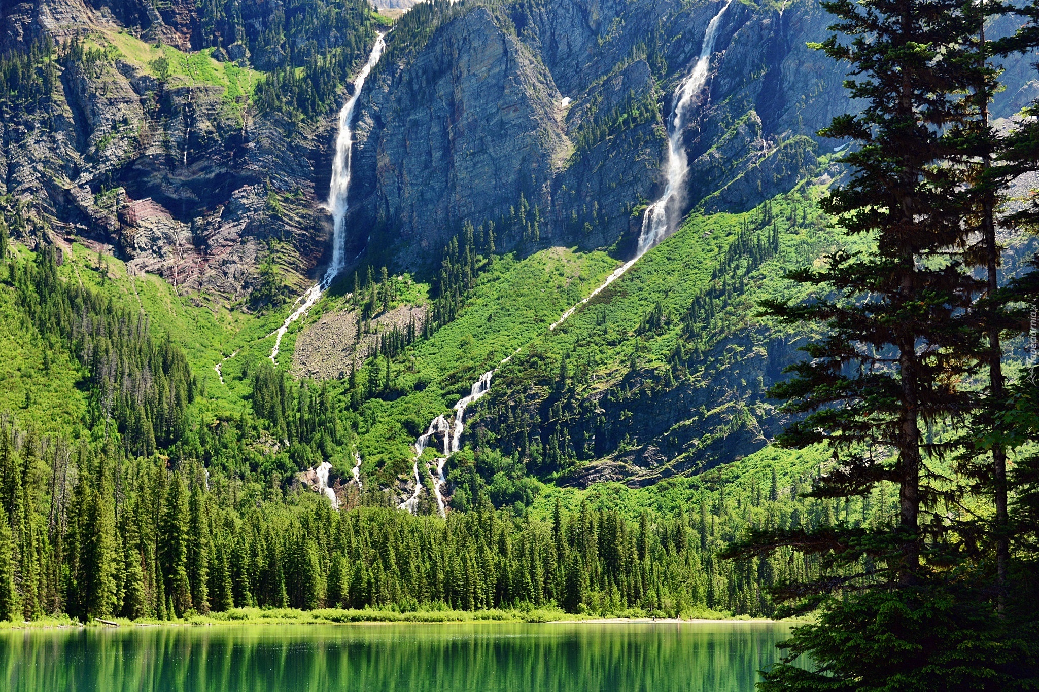 Edytor tapety: Stany Zjednoczone, Stan Montana, Park Narodowy Glacier, Jezioro Hidden Lake, Góry, Drzewa, Wodospady