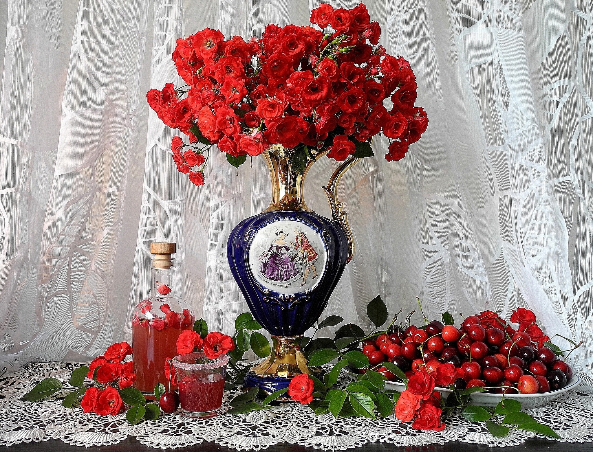 Edytor tapety: Wazon, Róże, Czereśnie, Martwa, Natura