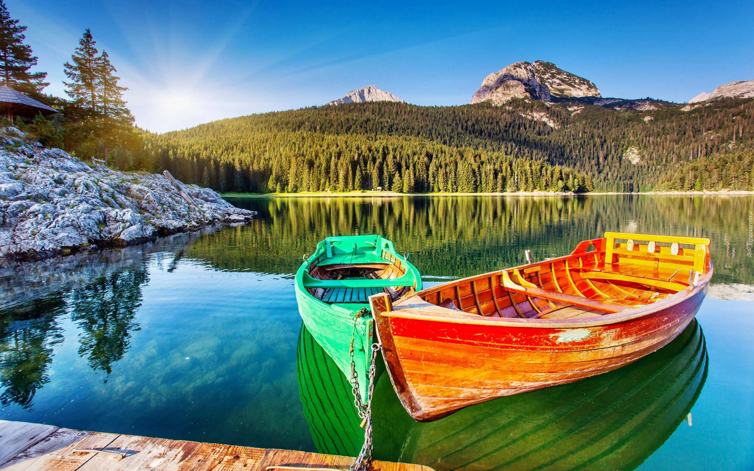 Edytor tapety: Góry, Promienie, Słońca, Jezioro, Kolorowe, Łódki