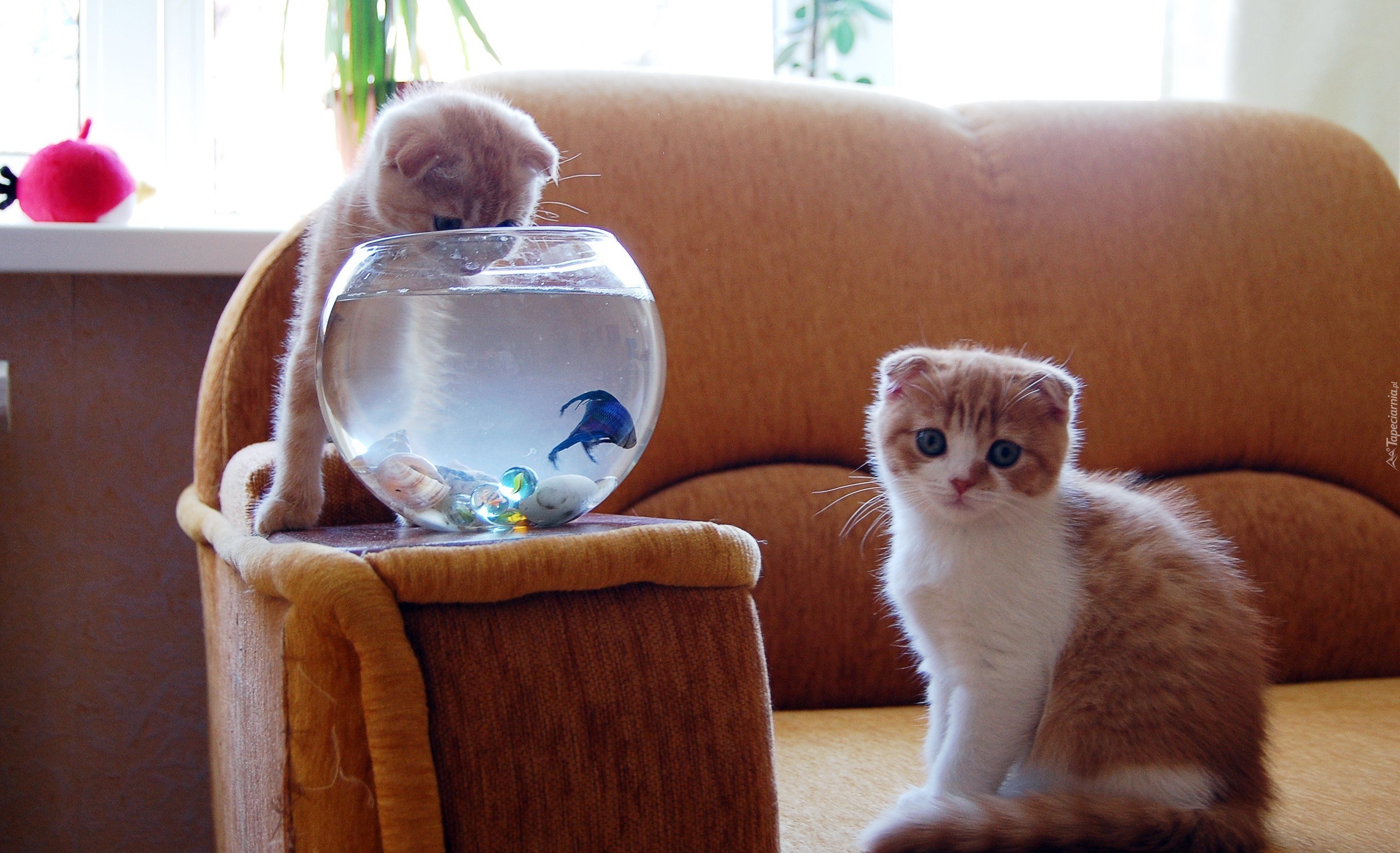 Edytor tapety: Dwa, Kotki, Akwarium, Rybki