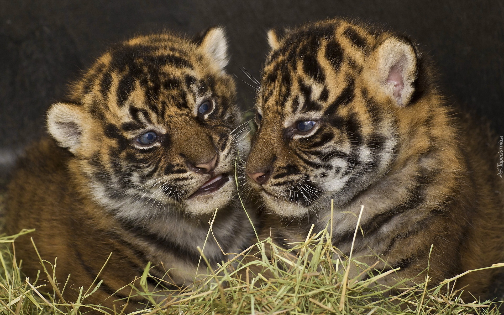 Edytor tapety: Dwa, Małe, Tygryski, Trawa