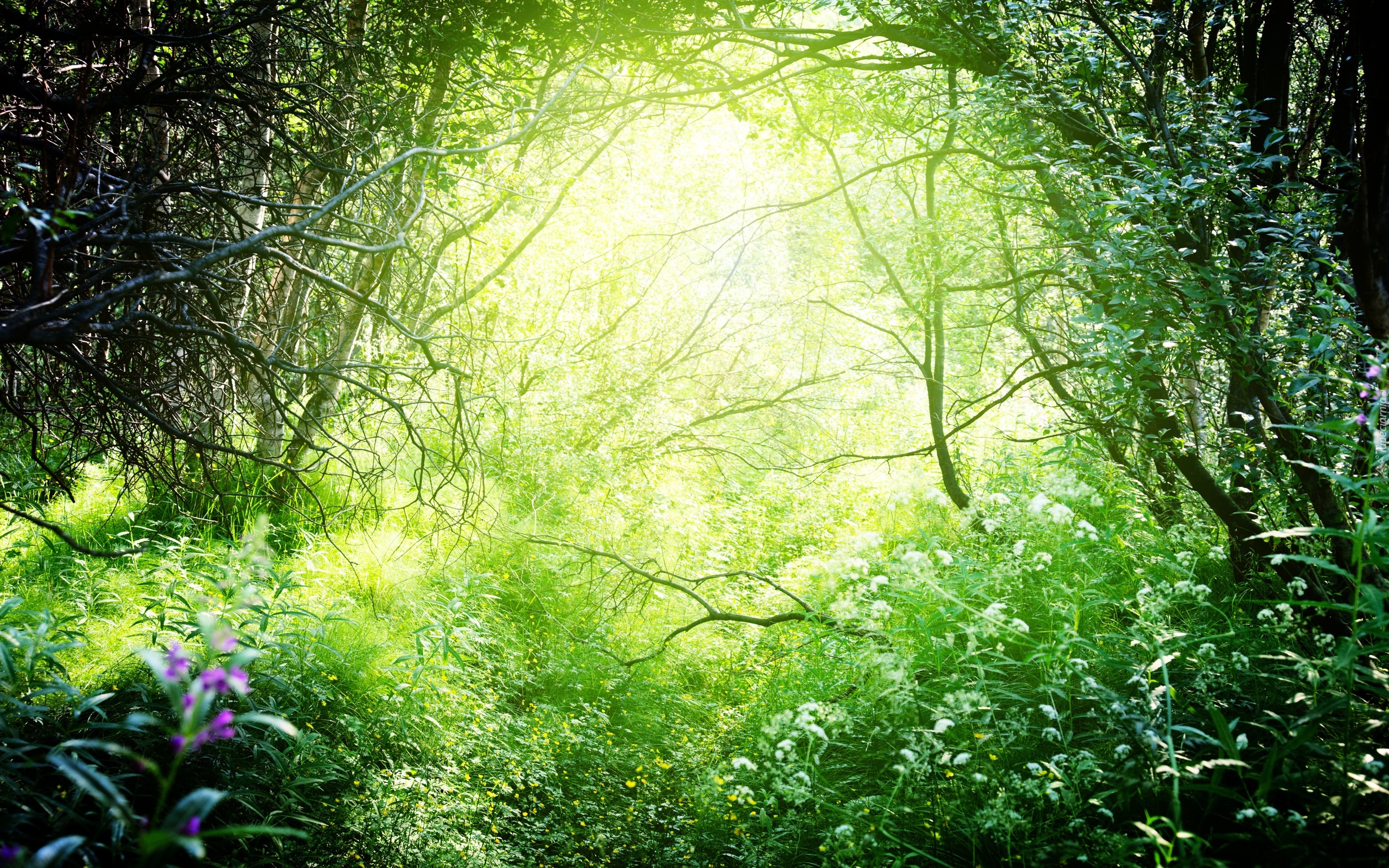 Edytor tapety: Las, Drzewa, Trawy, Kwiaty, Przebijające, Światło