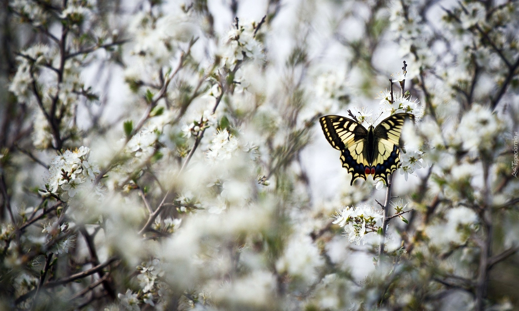 Edytor tapety: Motyl, Paź królowej, Gałązki, Białe, Kwiatuszki