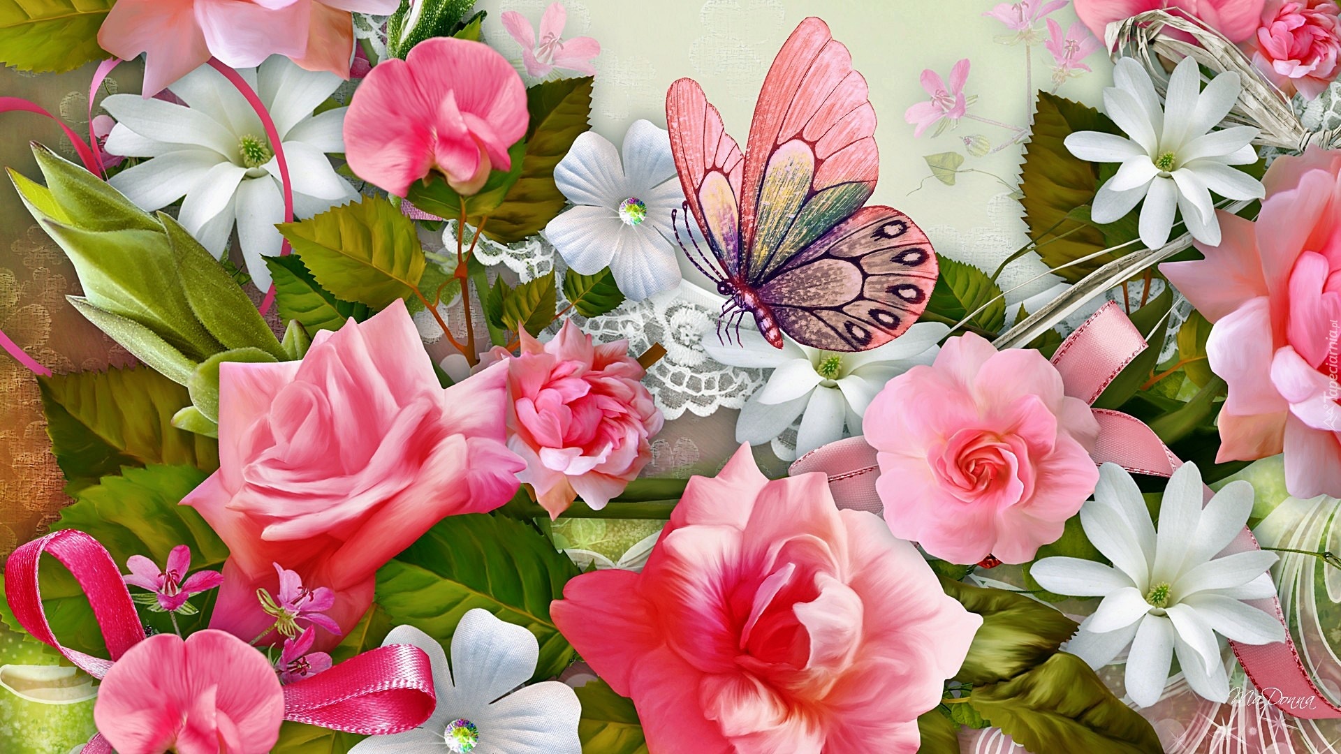 Edytor tapety: Różowe, Róże, Kwiaty, Motyl, Art