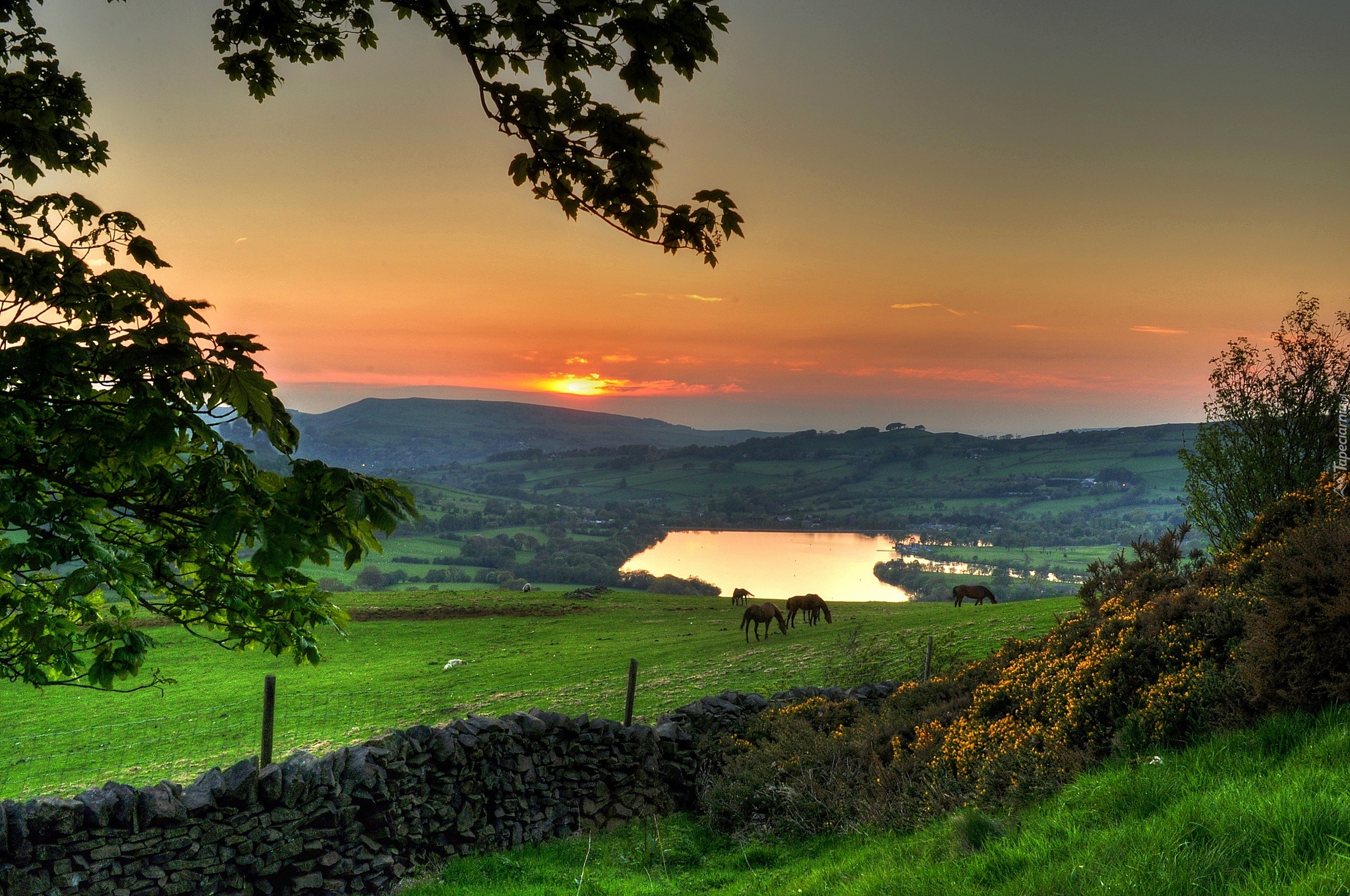 Edytor tapety: Rzeka, Góry, Łąki, Konie, Zachód, Słońca