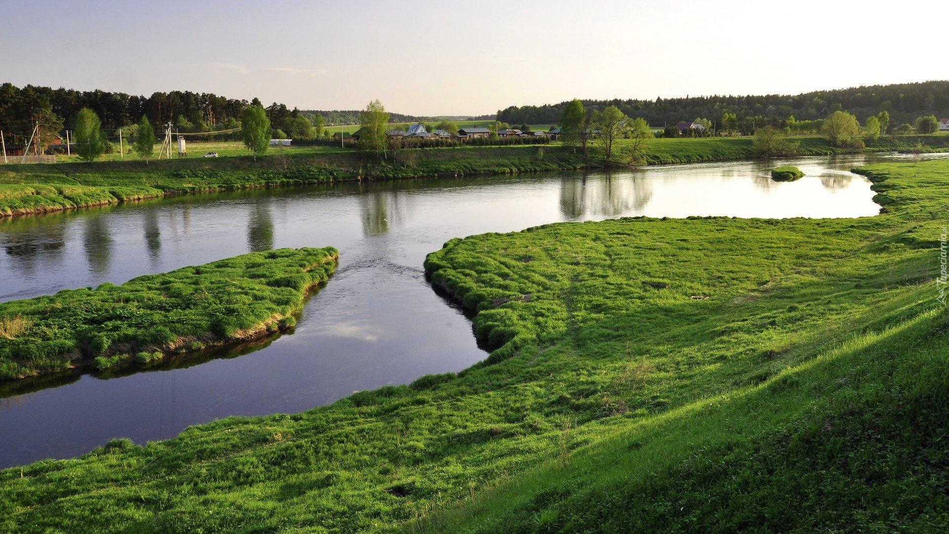 Edytor tapety: Rzeka, Pola, Trawa, Zabudowania