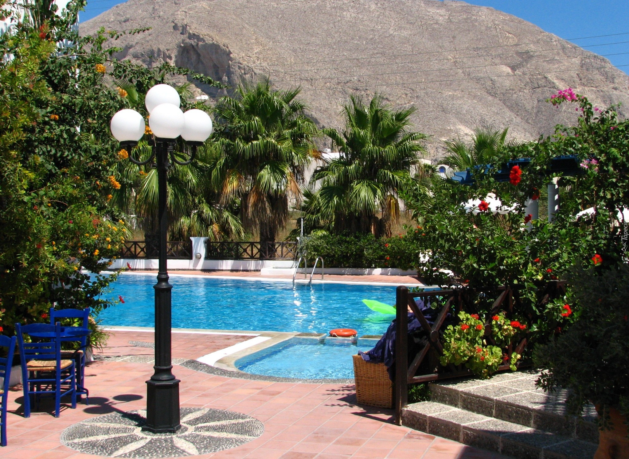 Edytor tapety: Basen, Palmy, Kwiaty, Santorini