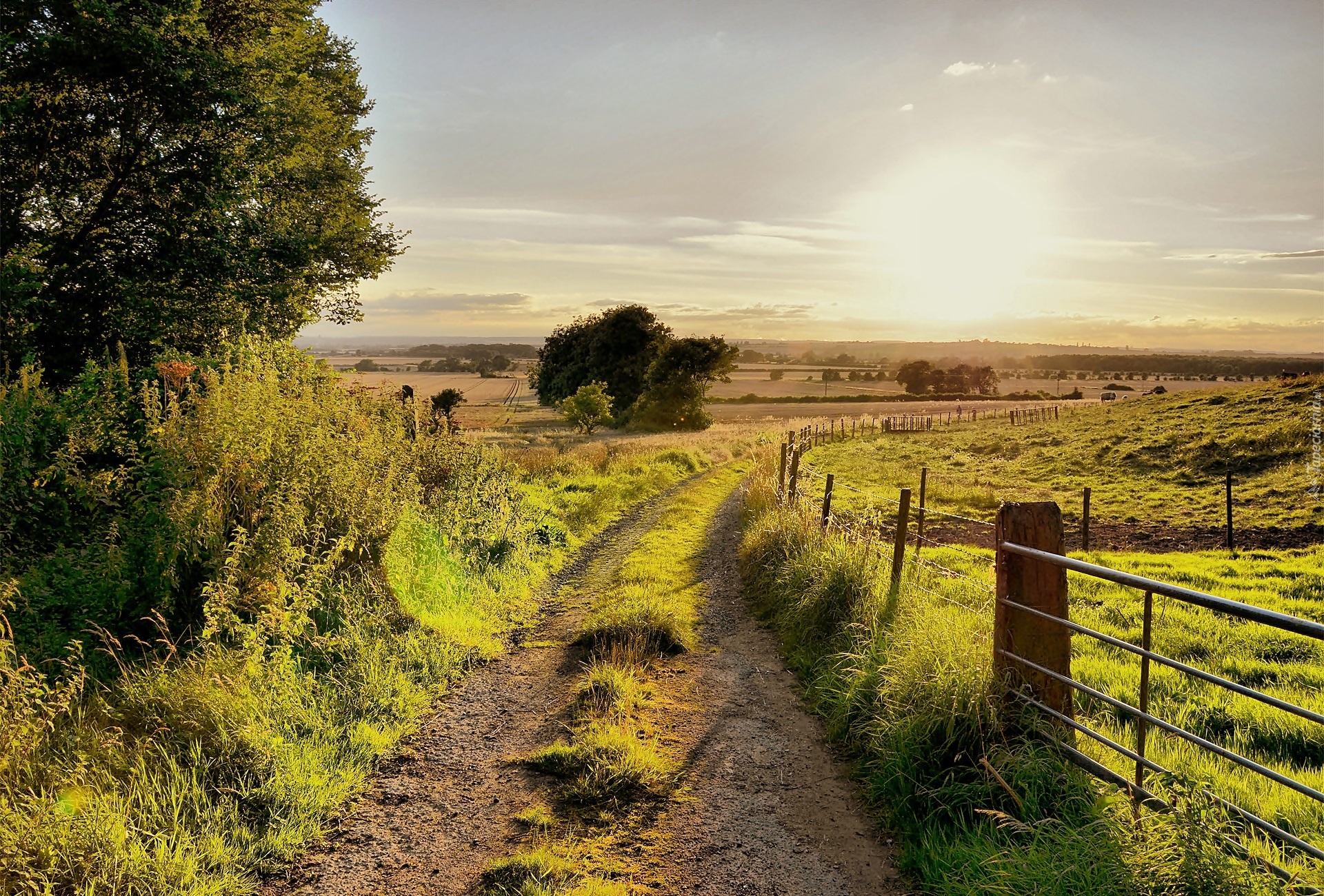 Edytor tapety: Droga, Pola, Ogrodzenie, Wschód, Słońca