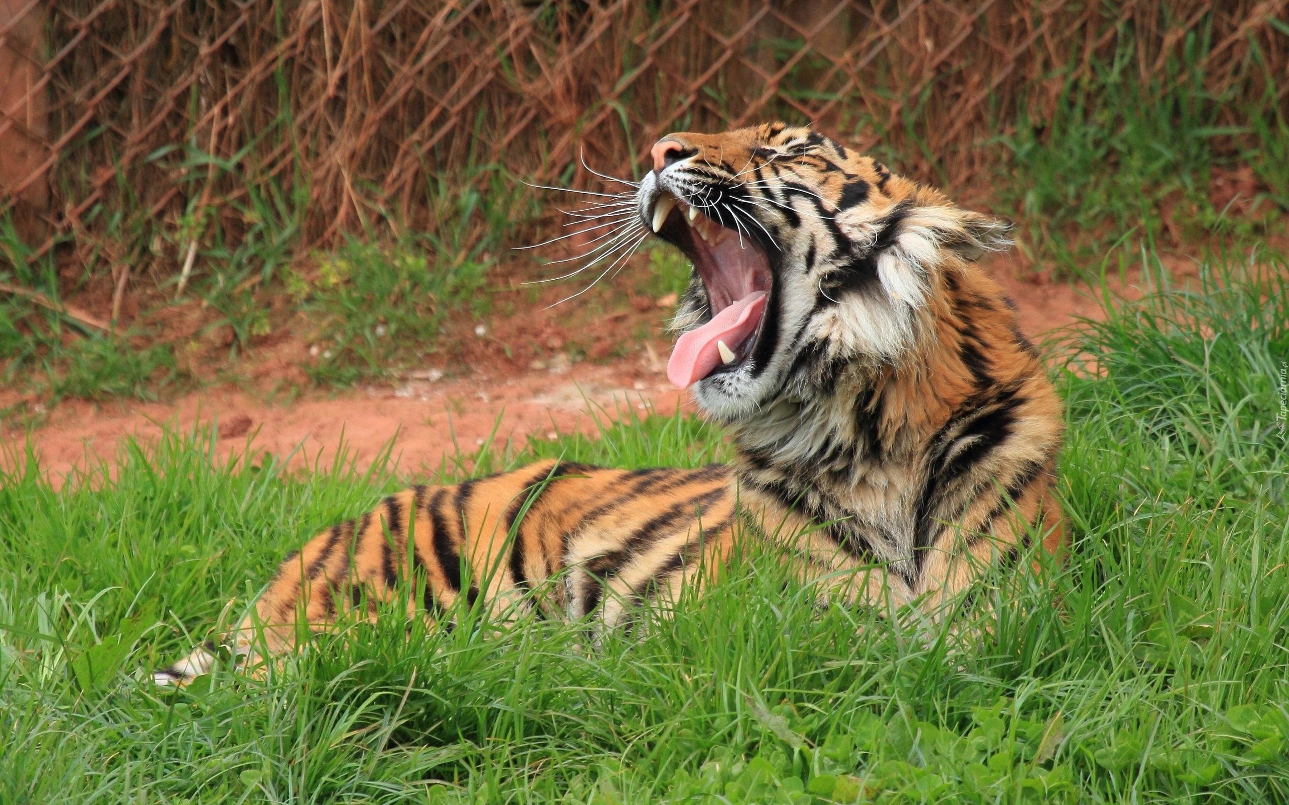 Edytor tapety: Tygrys, Trawa, Ogrodzenie