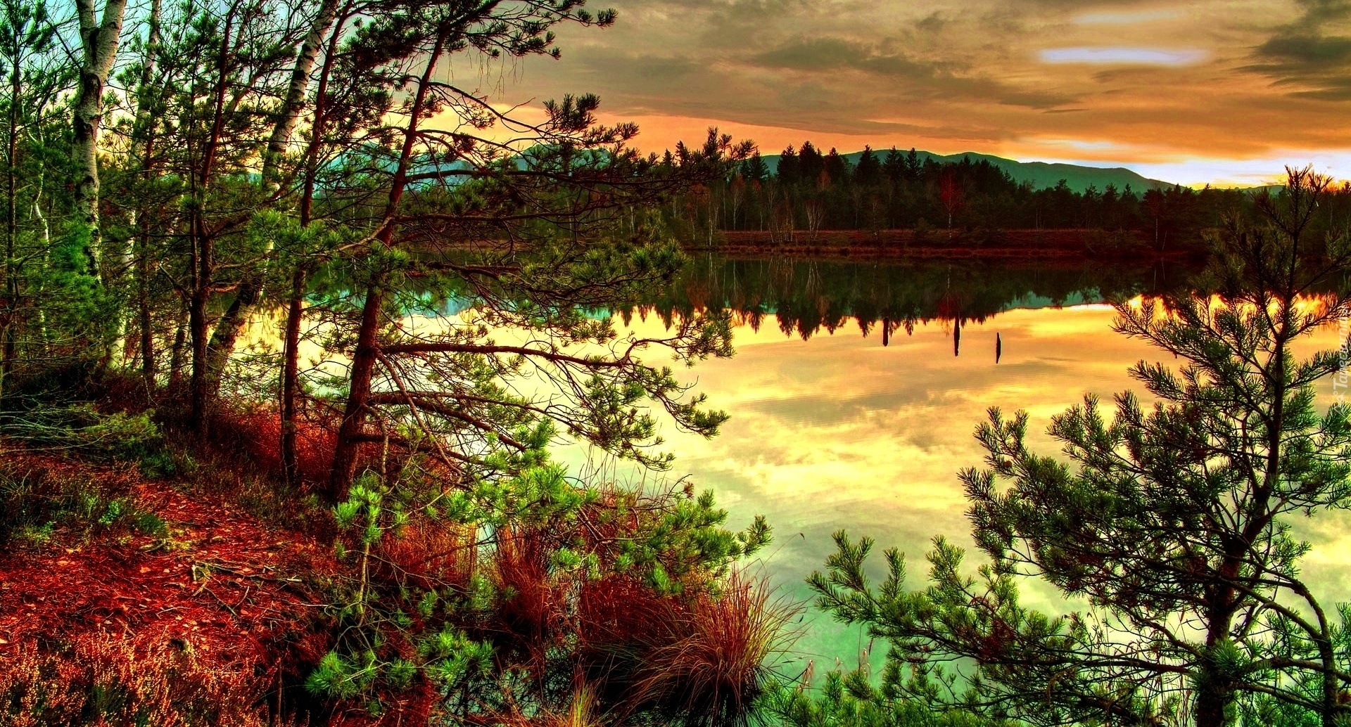 Edytor tapety: Jezioro, Zachód, Słońca, Lasy