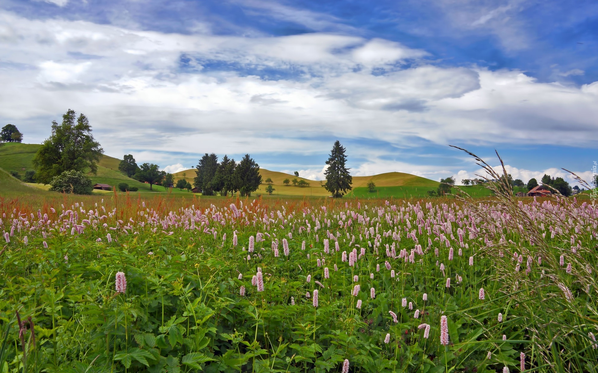 Edytor tapety: Łąki, Kwiaty, Drzewa, Góry
