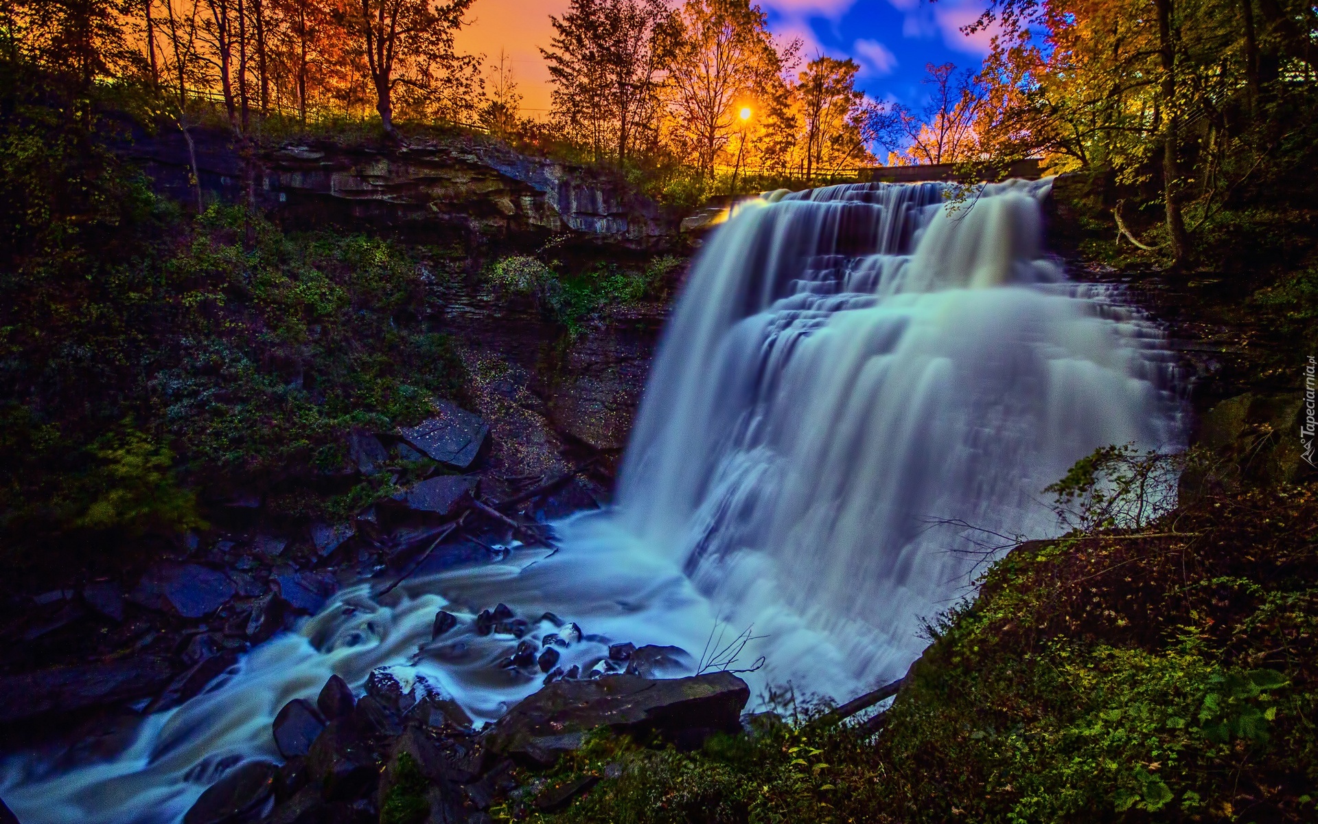 Edytor tapety: Wodospad, Skały, Drzewa, Przebijające, Światło