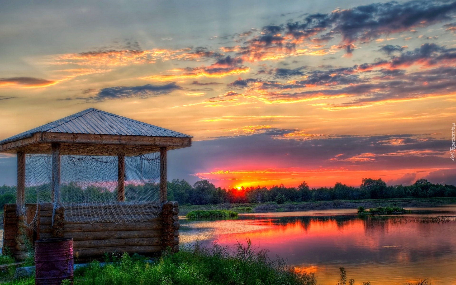 Edytor tapety: Jezioro, Zadaszenie, Chmury, Zachód Słońca