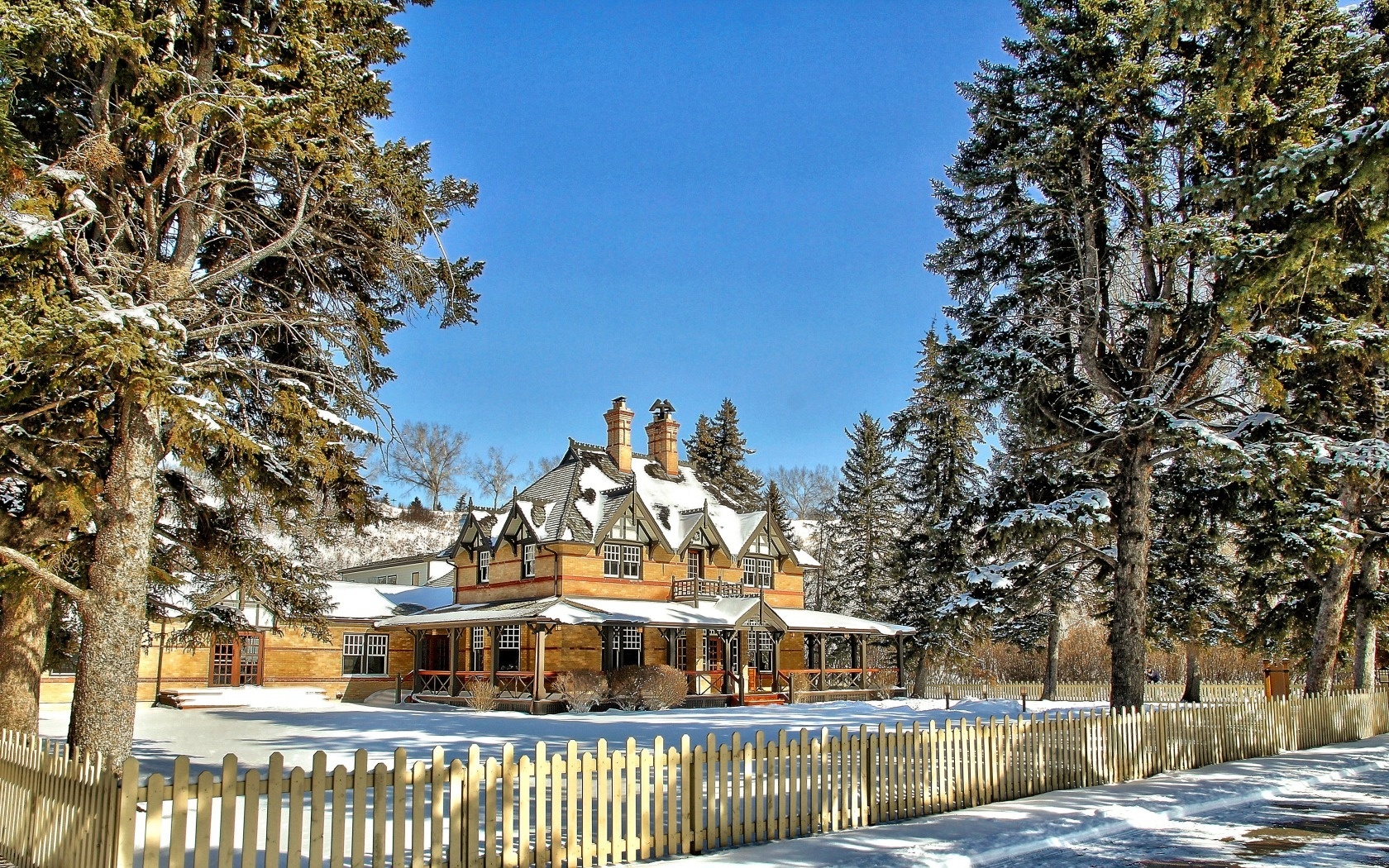 Edytor tapety: Zima, Dom, Posesja, Drzewa, Płot