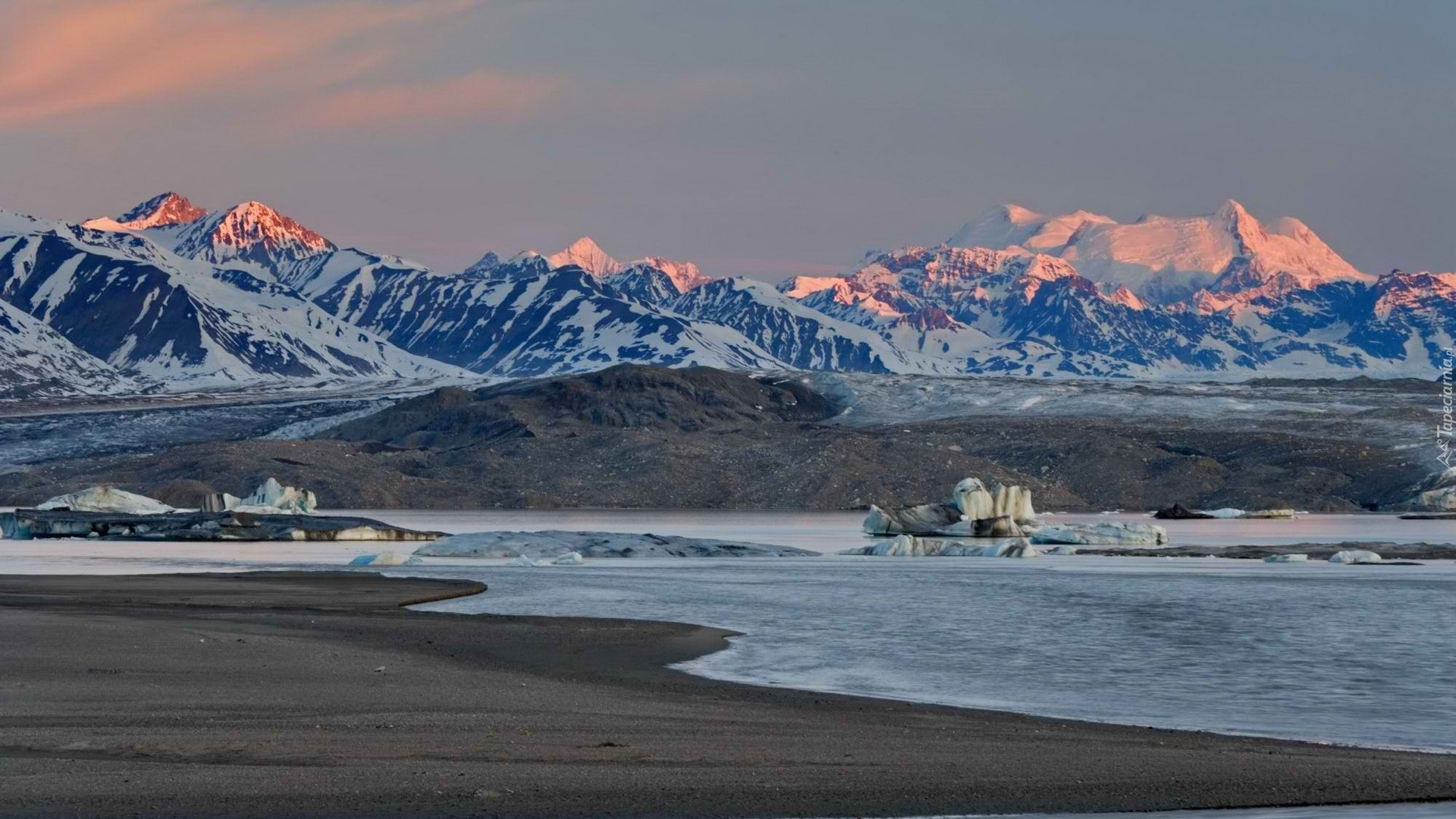 Edytor tapety: Góry, Śnieg, Zachód, Słońca, Rzeka, Kanada