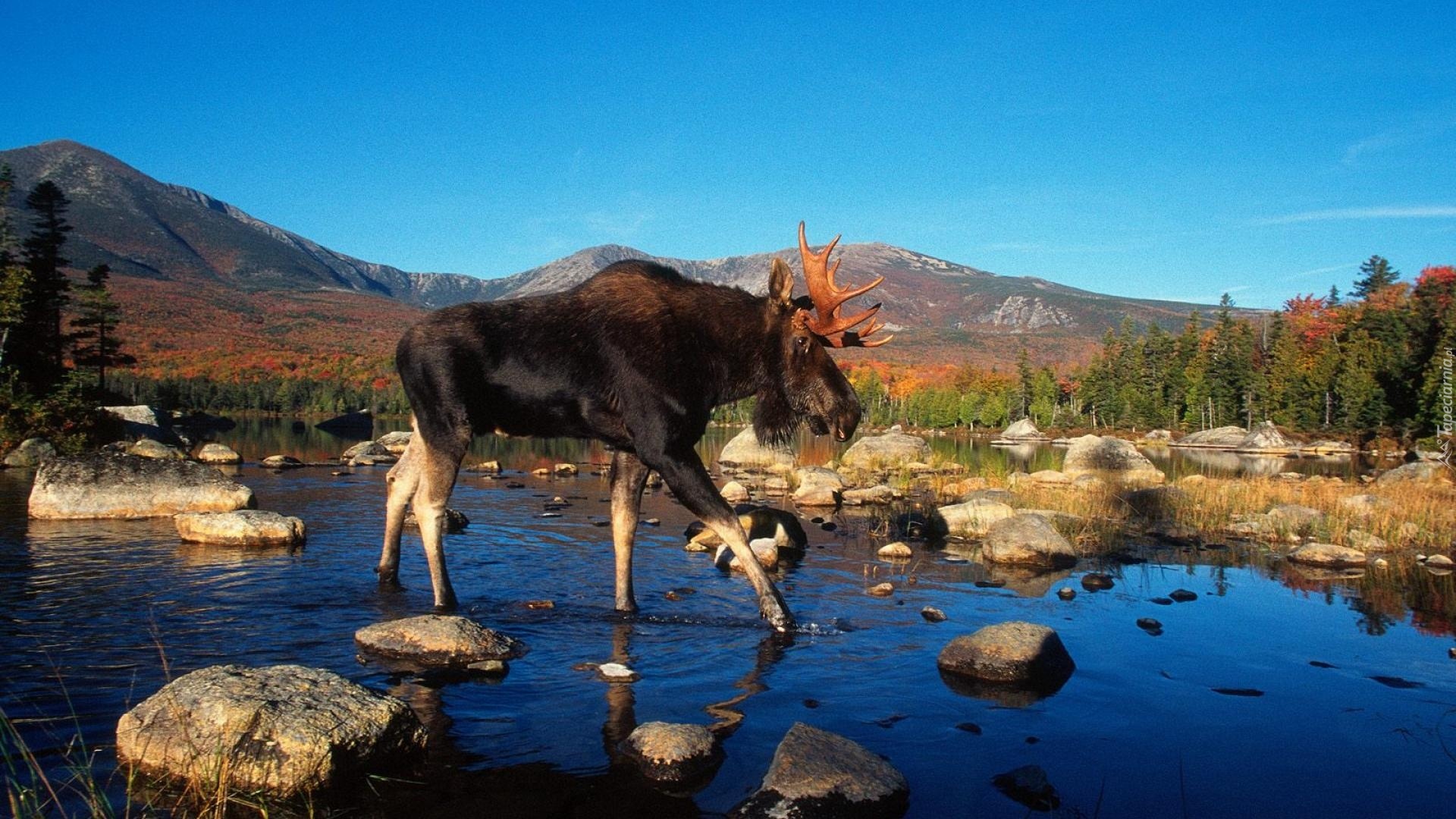 Edytor tapety: Łoś, Rzeka, Góry, Las, Niebo
