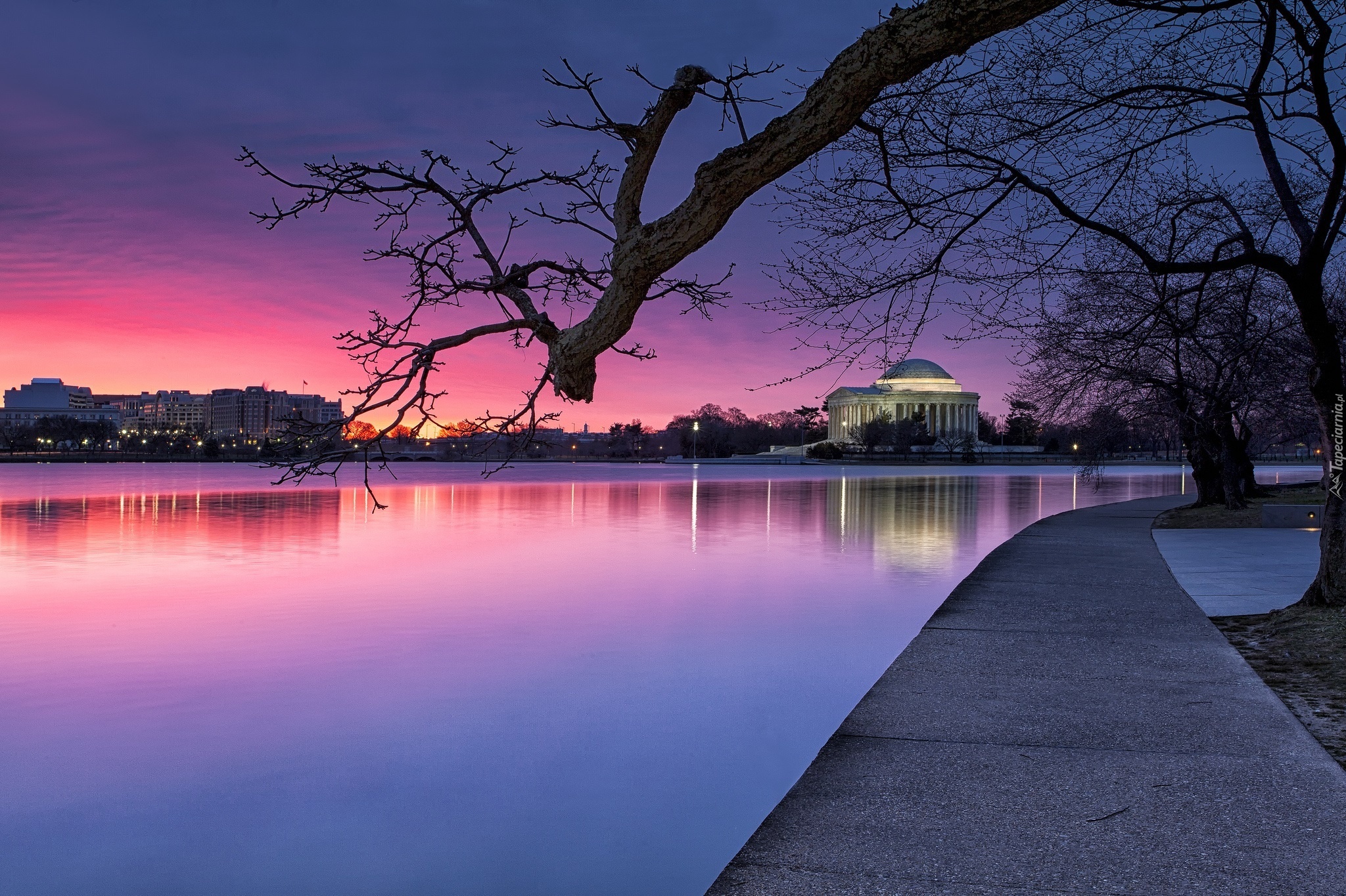 Edytor tapety: Rzeka, Bulwar, Drzewo, Zachód, Słońca