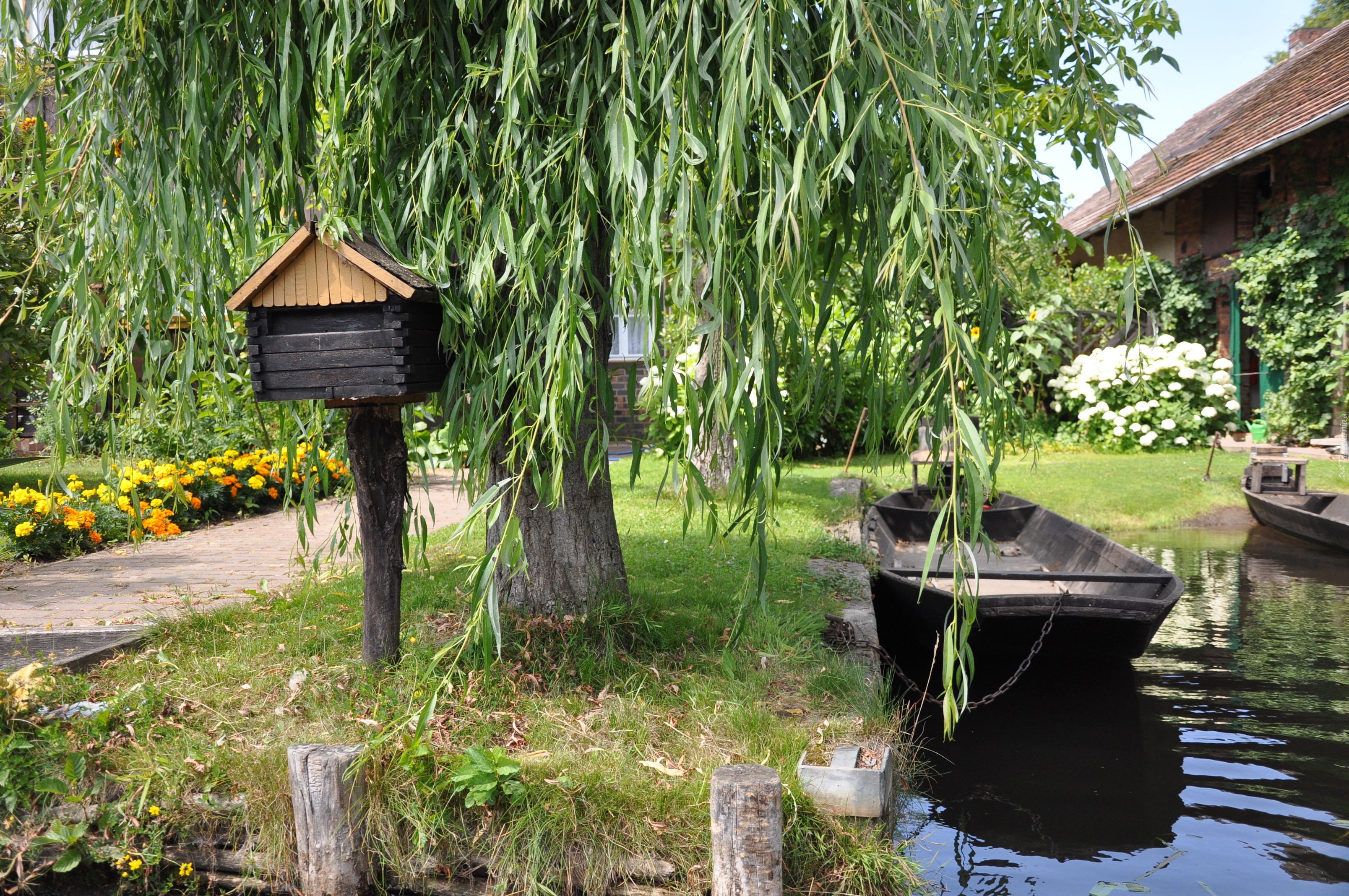 Edytor tapety: Park, Drzewa, Kwiaty, Jezioro, Przystań, Łodzie, Domy