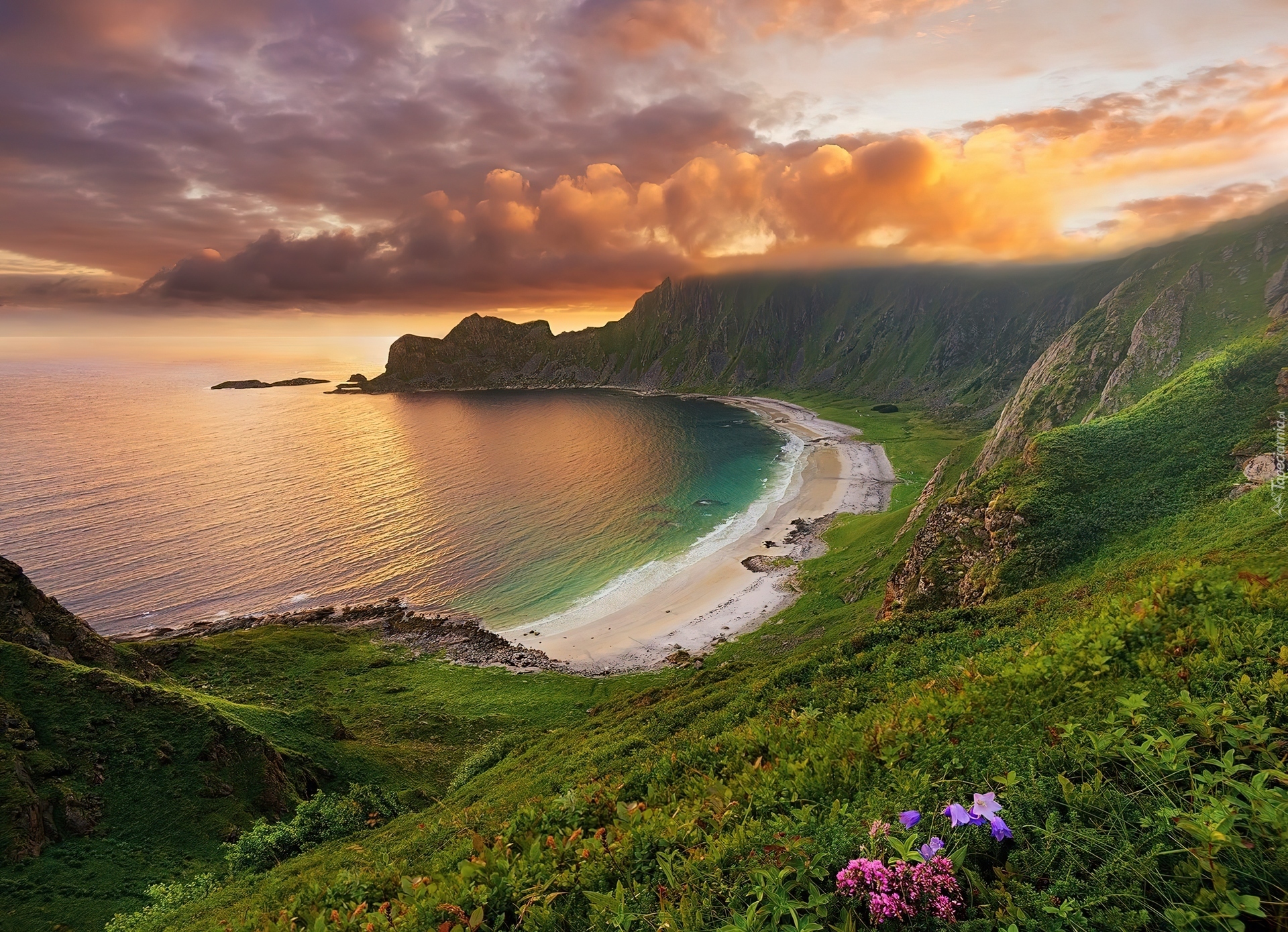 Edytor tapety: Zachód, Słońca, Chmury, Morze, Zatoka, Góry