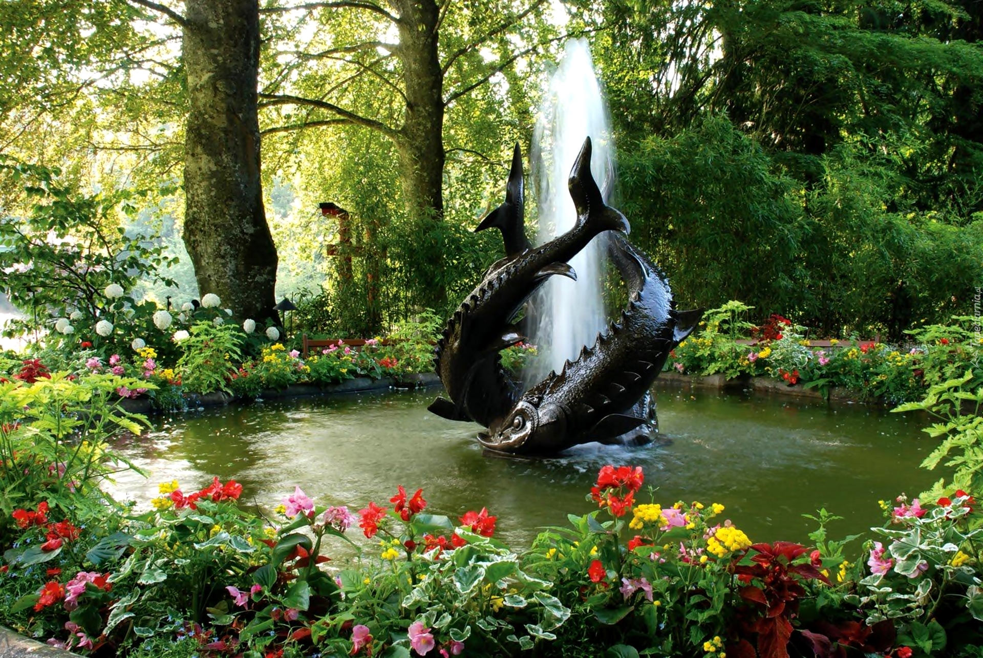 Edytor tapety: Fontanna, Rekiny, Woda, Kwiaty, Drzewa