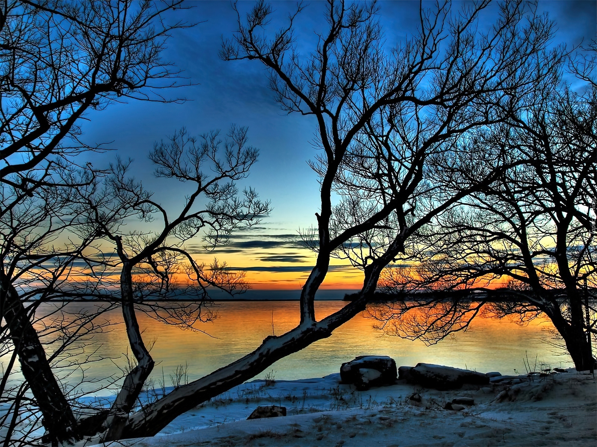 Edytor tapety: Zachód, Słońca, Rzeka, Nagie Drzewa, Śnieg, Kamienie