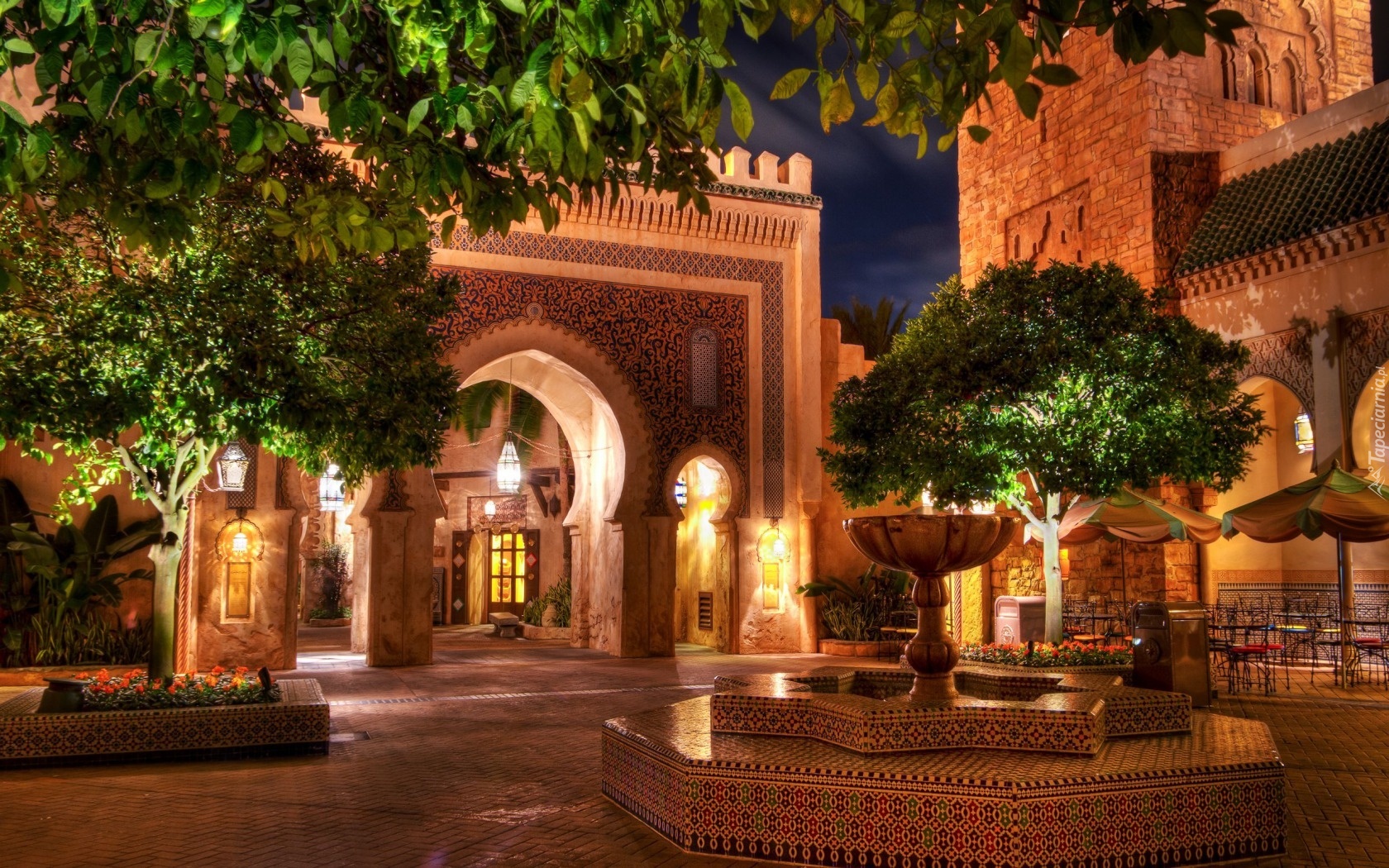 Edytor tapety: Restauracja, Kawiarnia, Fontanna, Drzewa