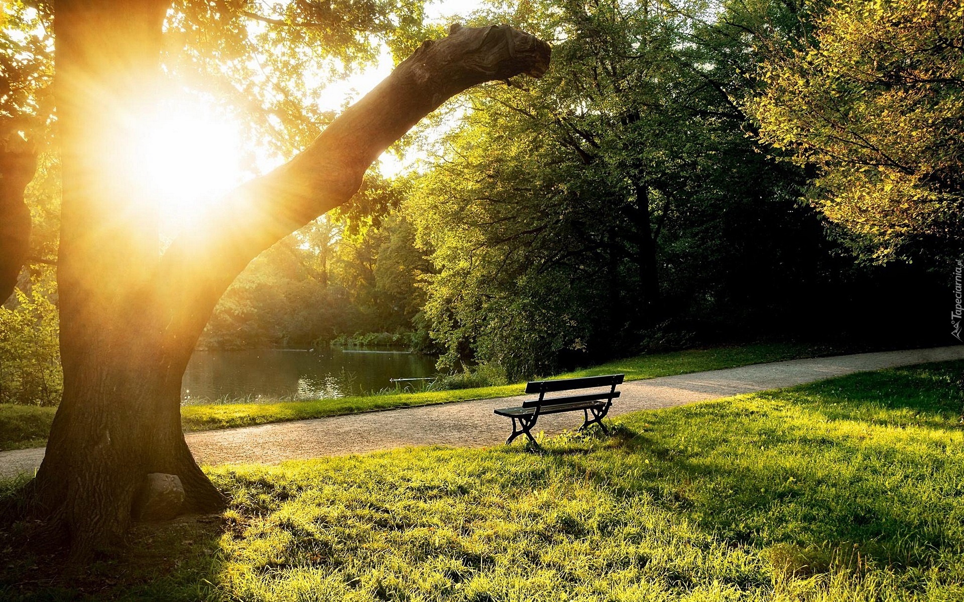 Edytor tapety: Park, Ławka, Przebijające, Słońce