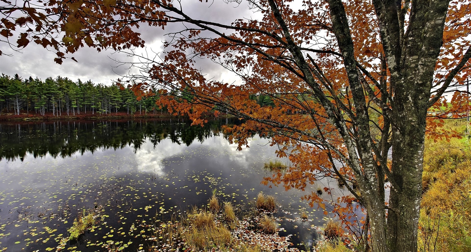 Edytor tapety: Jezioro, Las, Sosnowy, Drzewo, Liście