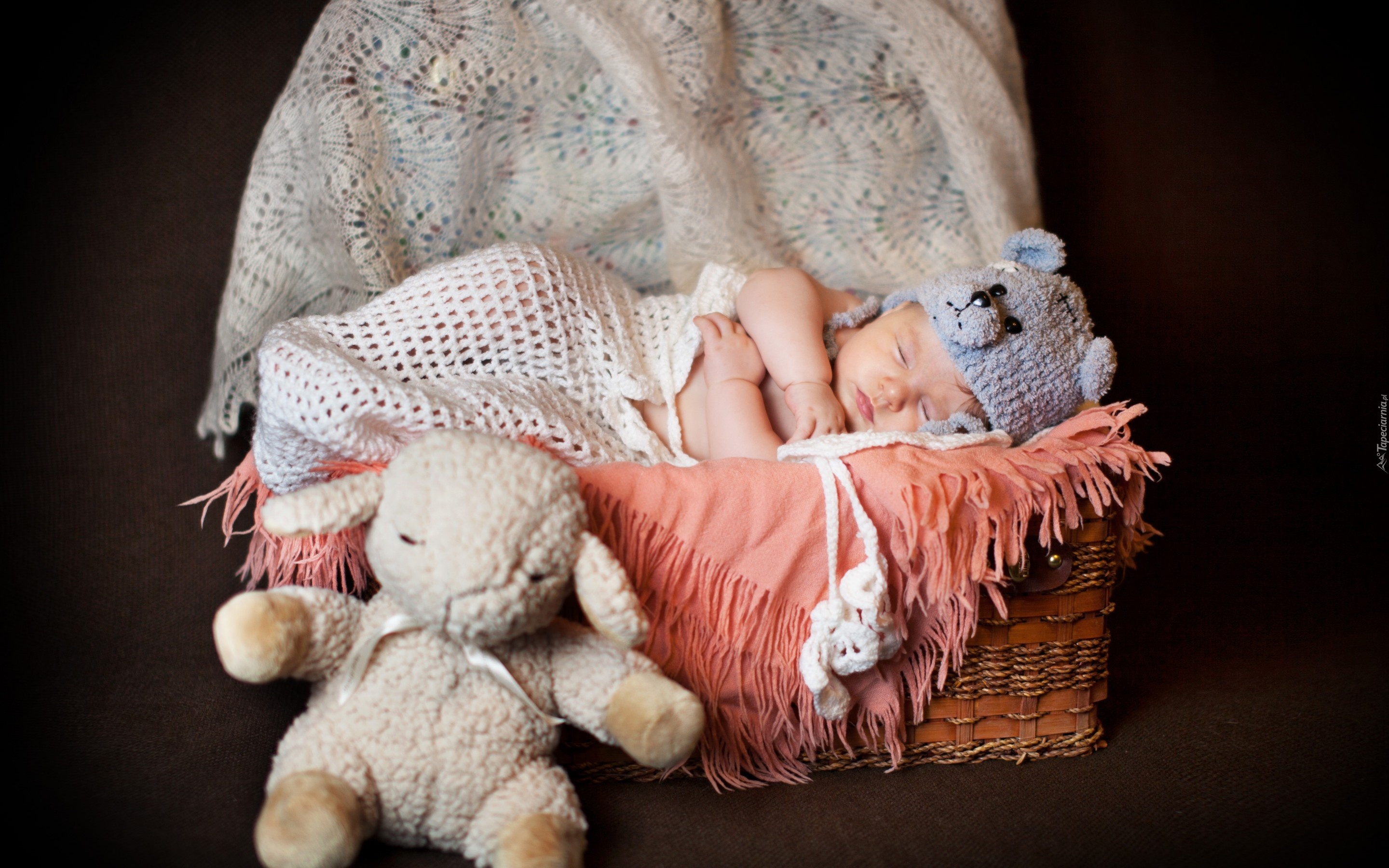 Edytor tapety: Śpiące, Dziecko, Czapeczka, Kocyk, Dzianina, Kosz, Pluszak, Zabawka