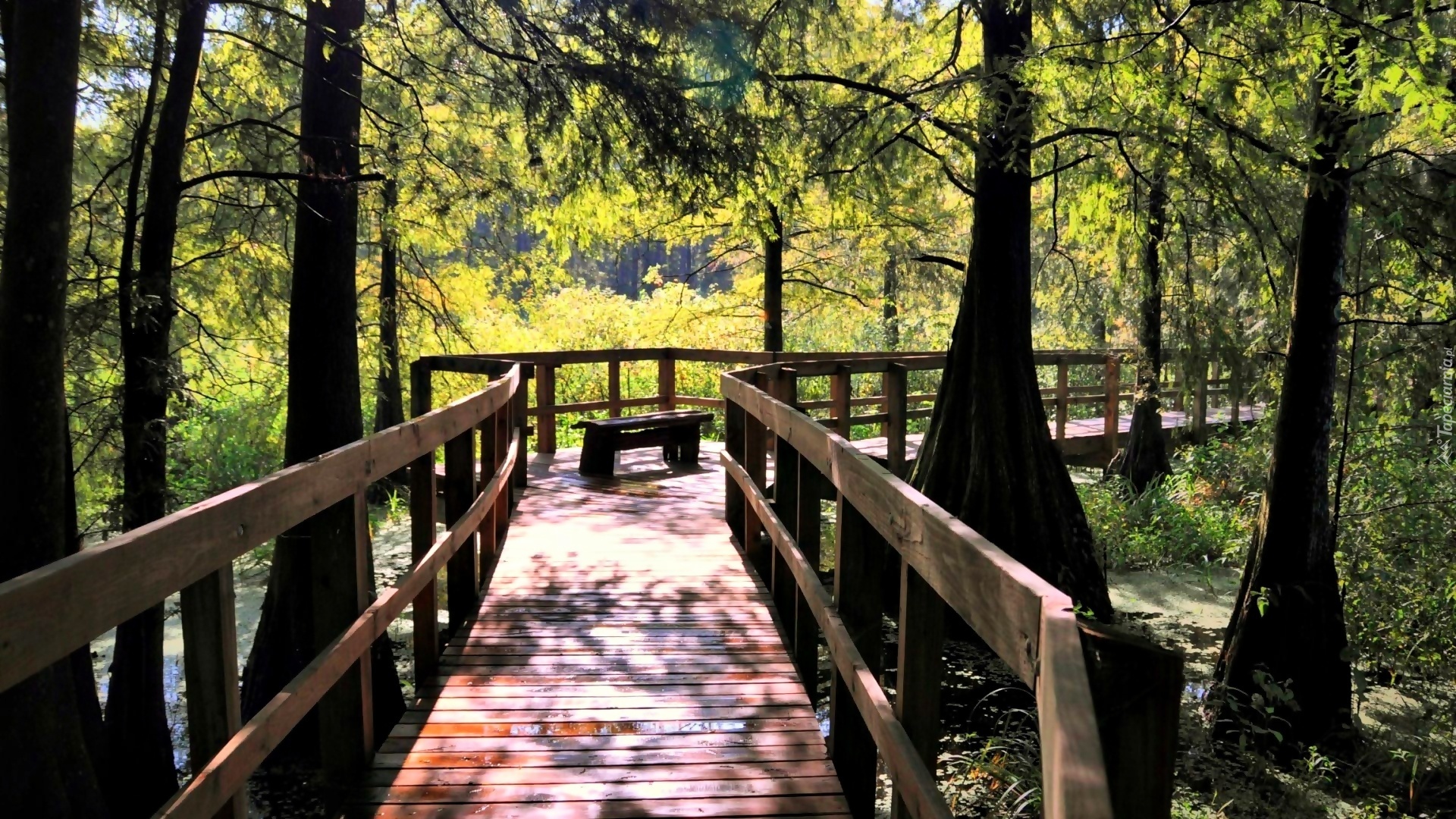 Edytor tapety: Las, Moczary, Drewniany, Most, Przebijające, Światło