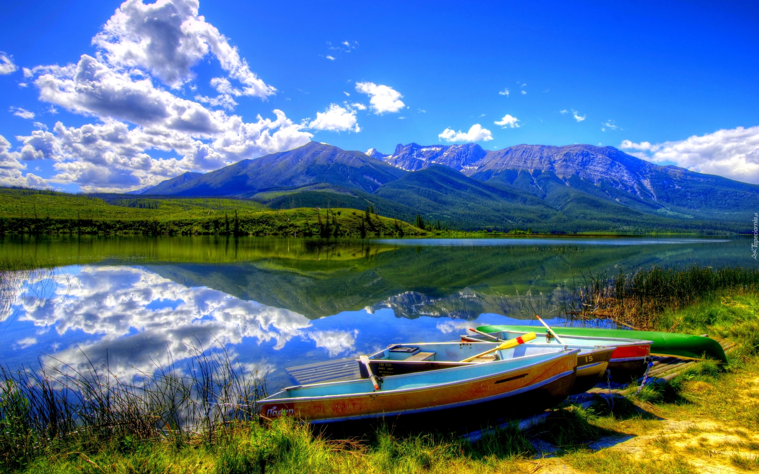 Edytor tapety: Łodzie, Wiosła, Jeziorko, Góry, Niebo