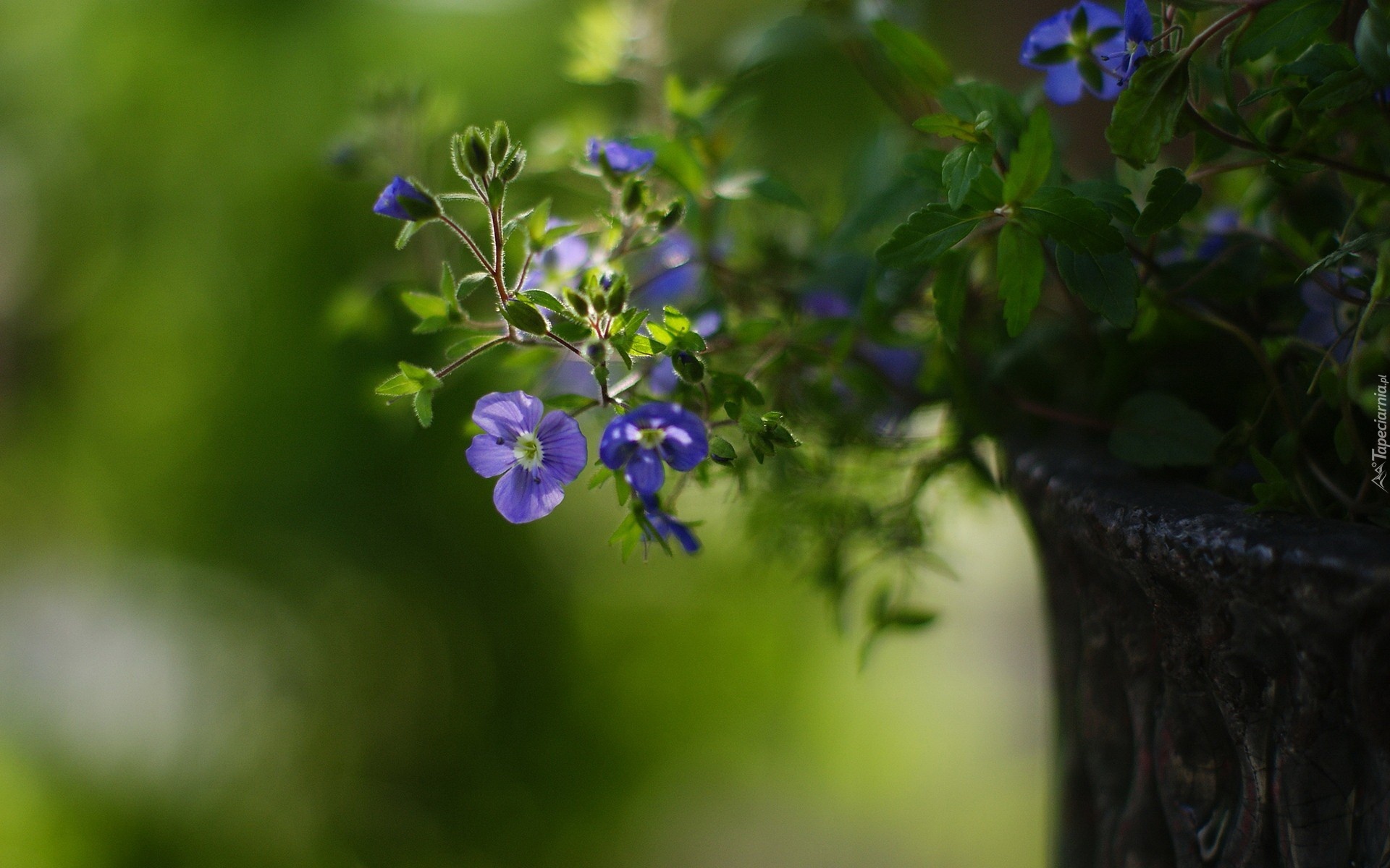 Edytor tapety: Niebieskie, Kwiatuszki, Donica, Park