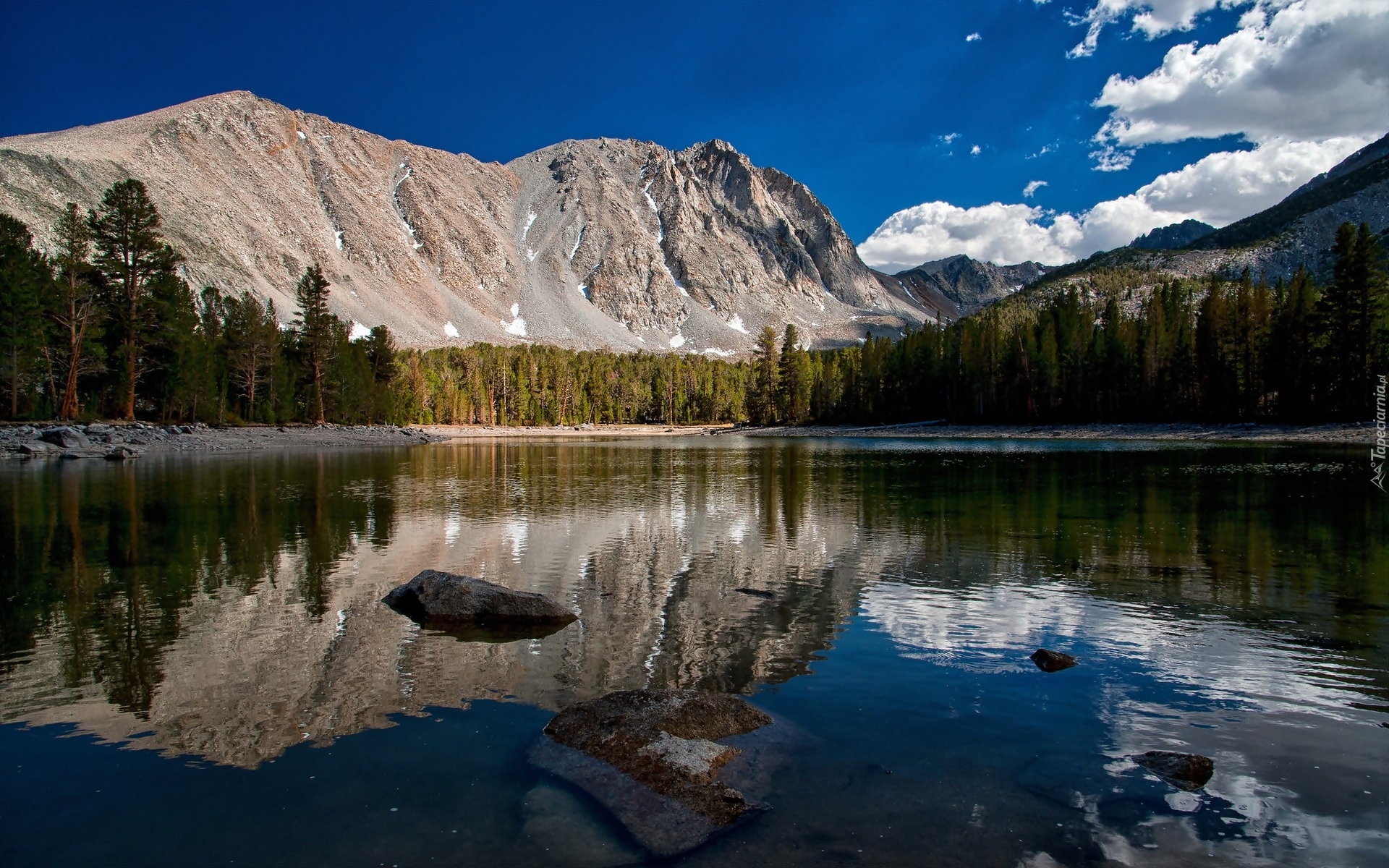 Edytor tapety: Jezioro, Skała, Świerki, Odbicie, Chmury
