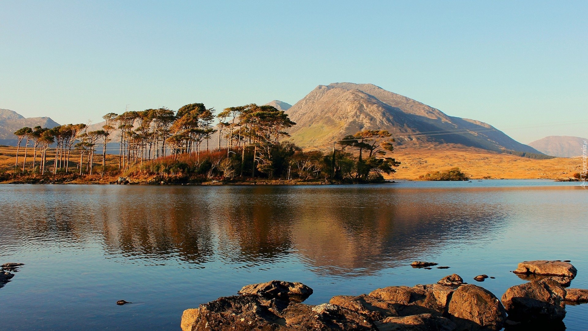 Edytor tapety: Jezioro, Sosny, Kamienie, Góry