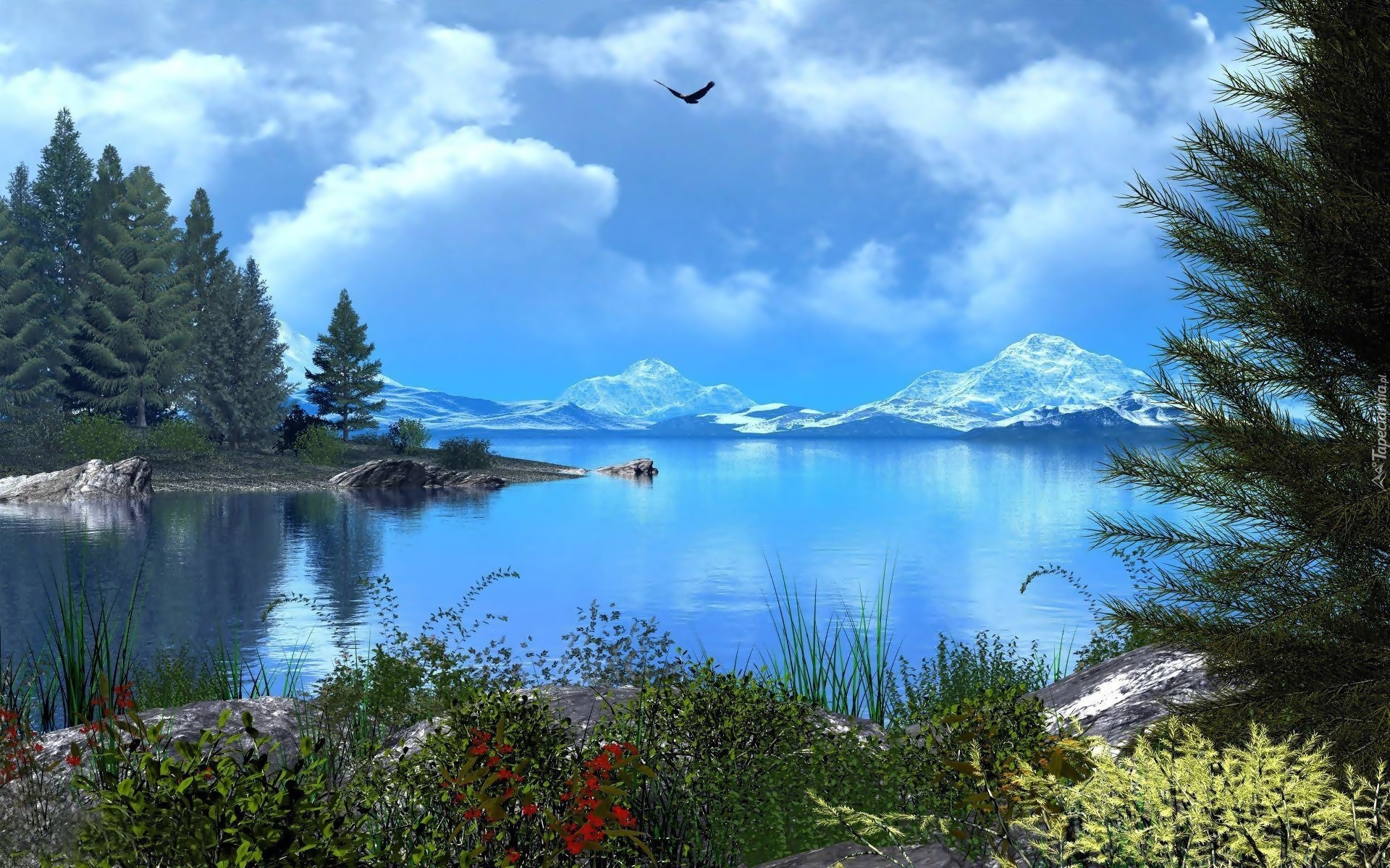 Edytor tapety: Góry, Jezioro, Drzewa, Ptak