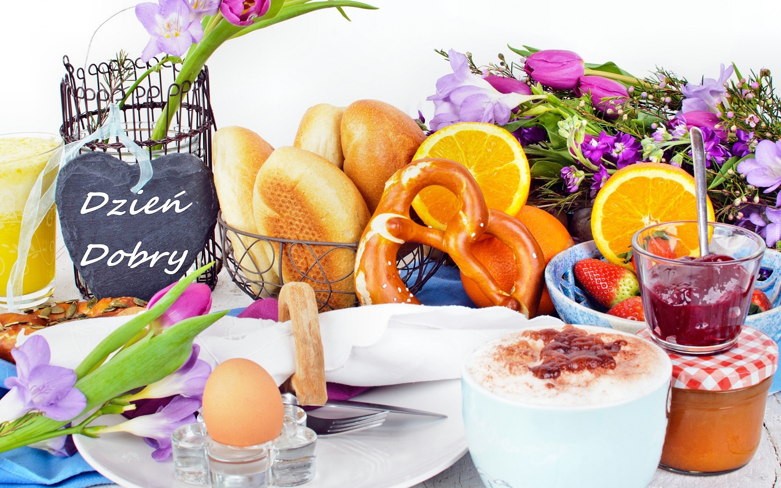 Edytor tapety: Bułki, Jajko, Kawa, Kwiaty, Śniadanie