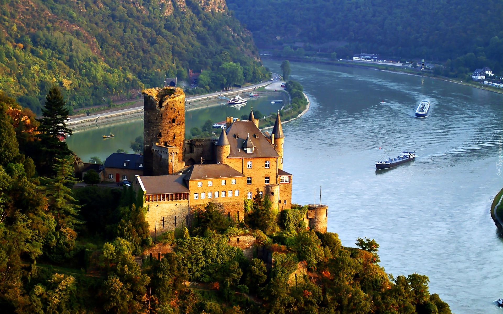 Edytor tapety: Zamek Katz, Burg Katz, Sankt Goarshausen, Rzeka Ren, Niemcy, Statki, Góry