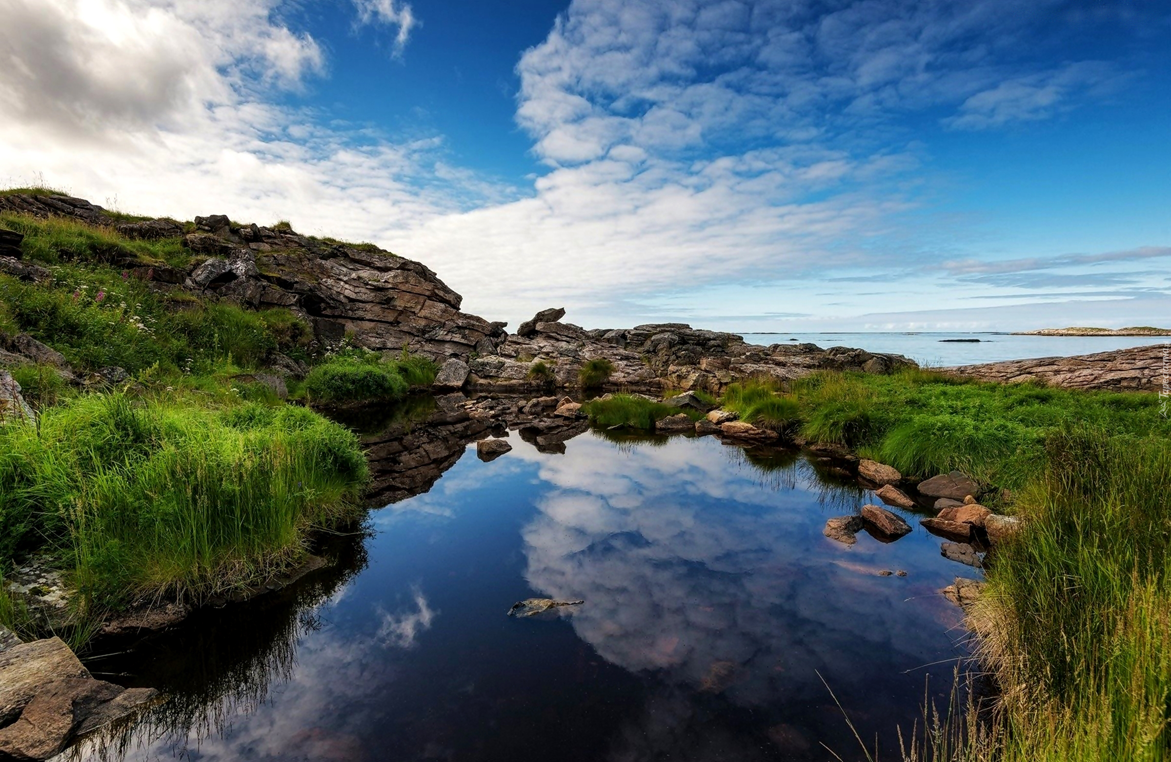 Edytor tapety: Jezioro, Skały, Chmury, Odbicie