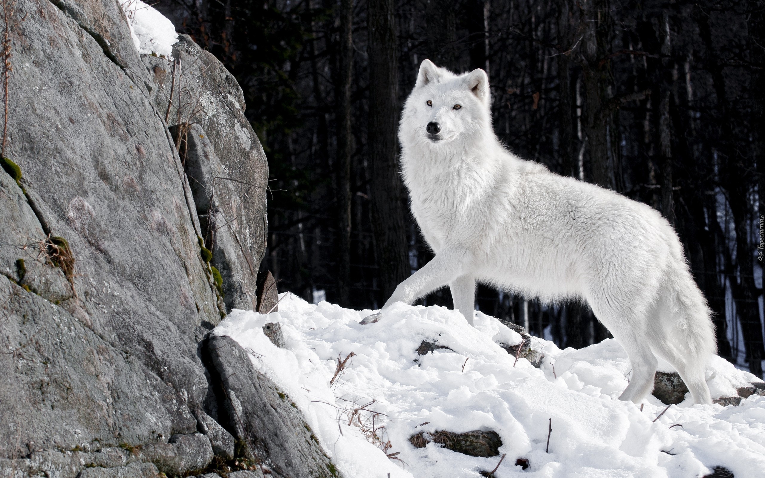 Edytor tapety: Biały, Wilk, Skały, Las, Zima