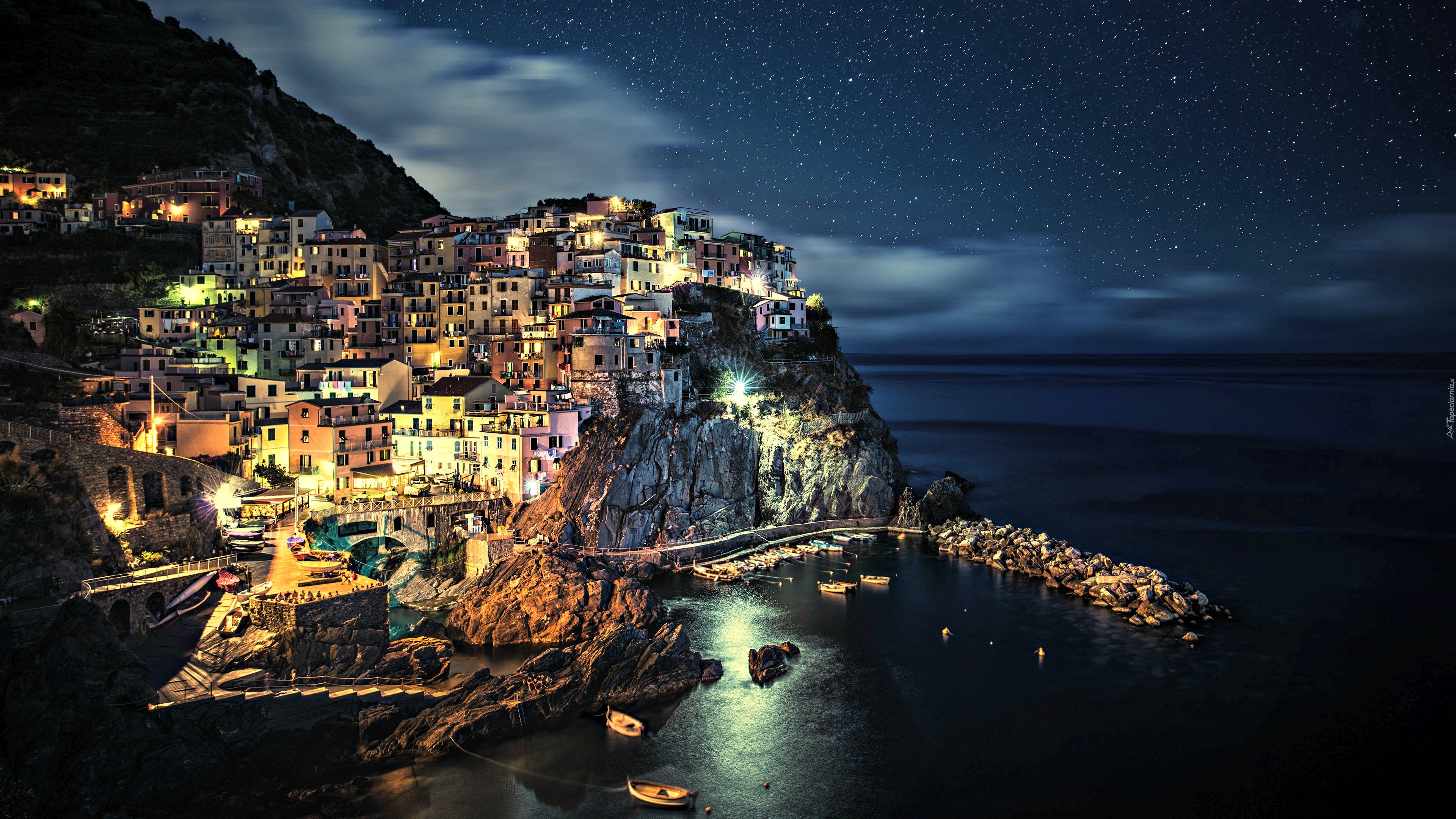 Edytor tapety: Manarola, Włochy, Zatoka, Morze, Skały, Noc