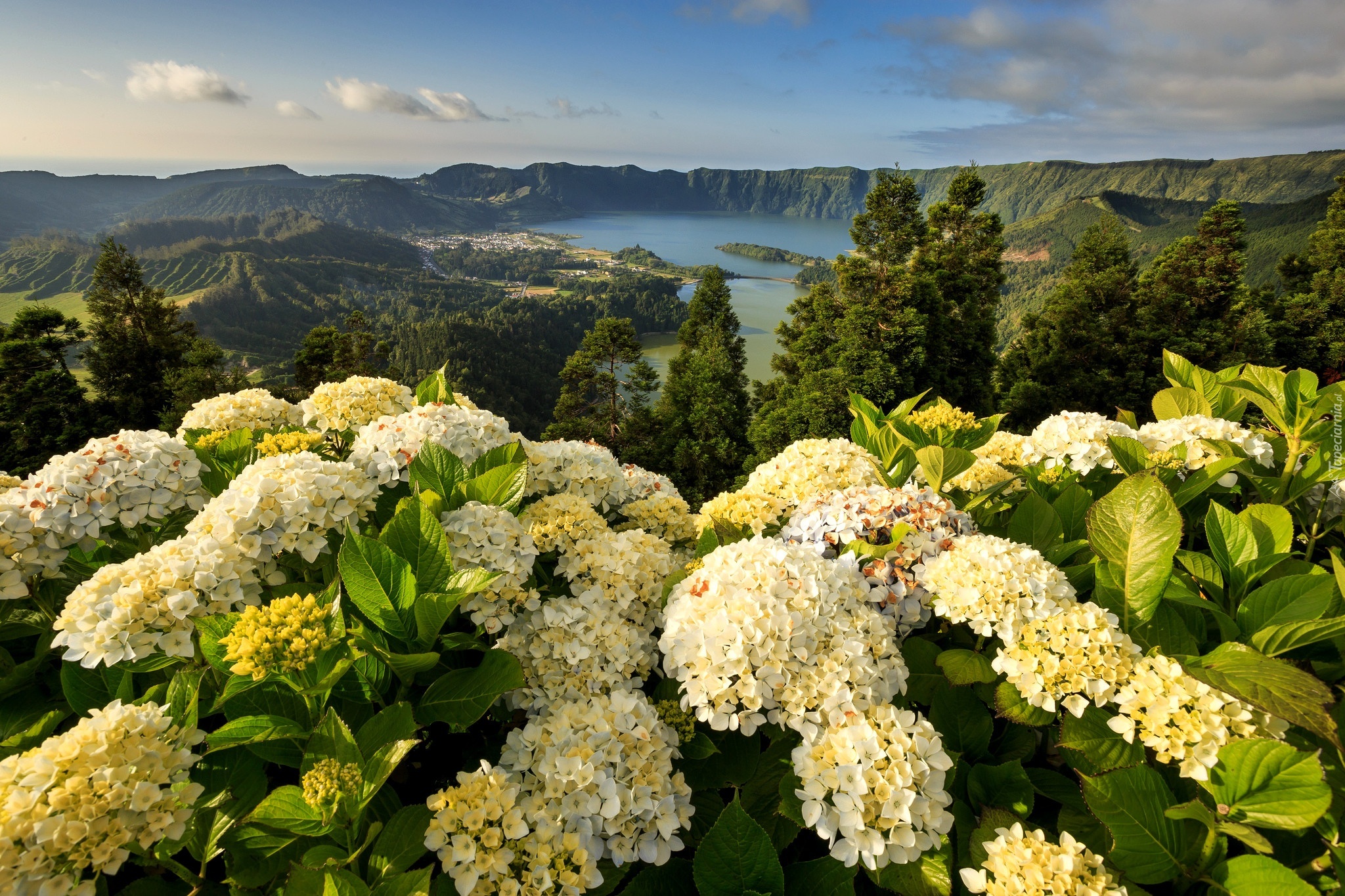 Edytor tapety: Hortensje, Góry, Jezioro, Azory, Portugalia