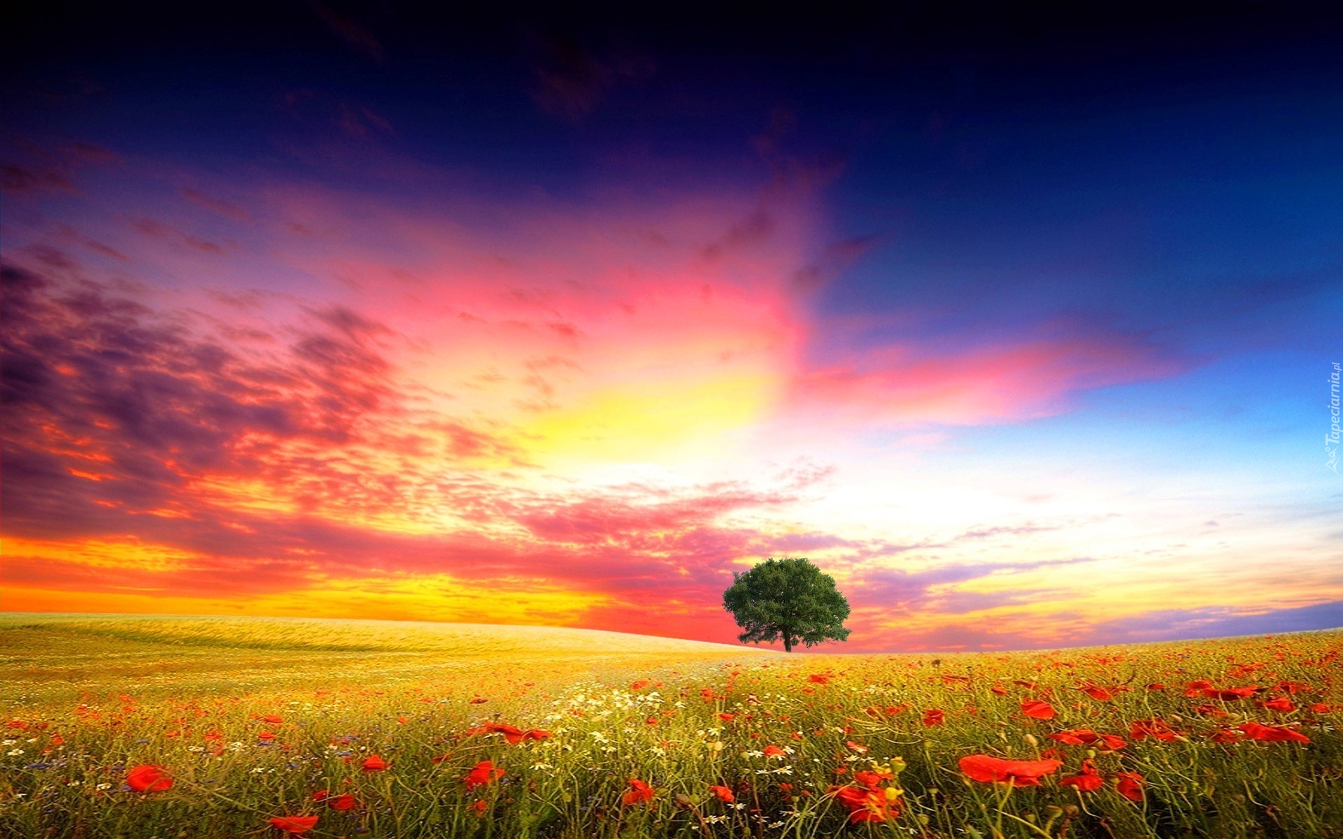 Edytor tapety: Łąka, Kwiaty, Drzewo, Chmury